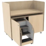 Berken extra brede commode, verrijdbaar. De trap is opgeborgen in het rechterkastje en kan eenvoudig aangetrokken en stevig vastgezet worden. De commode is elektrisch in hoogte verstelbaar (85-105 cm).
