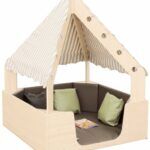 het knusse huisje heeft een interieur voorzien van zit- en zijkussens van kunstleer. Het kunstleer kan eenvoudig worden gereinigd met een vochtige doek. Het stoffen dak kan eenvoudig met klittenband worden bevestigd aan de uitsparingen in de dakgevel en kan te allen tijde worden verwijderd om te worden schoongemaakt.