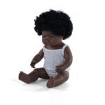 Beschrijving Miniland Pop Afrikaans Meisje met haar – 38 cm