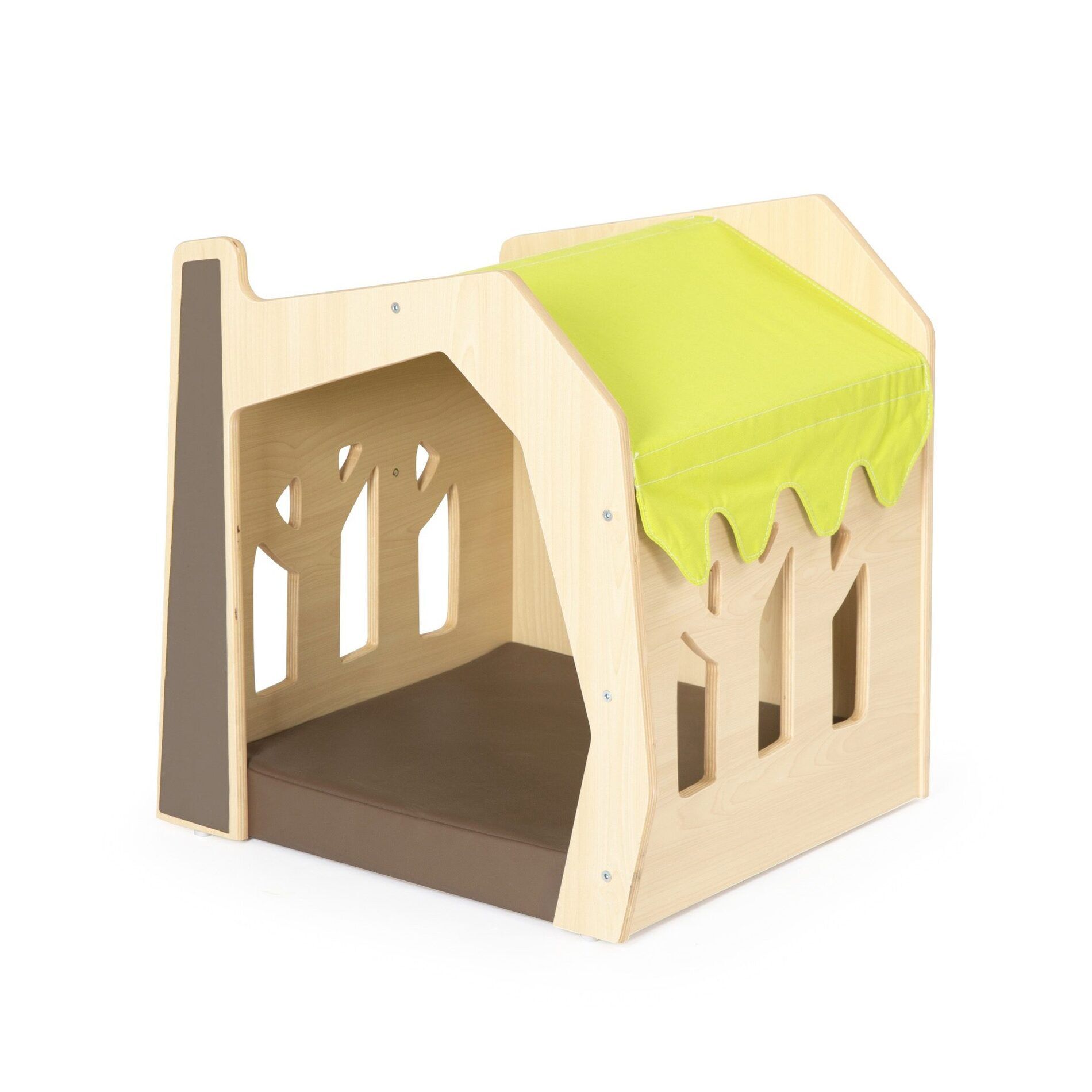 Het kleine speelhuisje vooinxtiel dak lijkt het net een grot. De kinderen kijken door de uitsparingen naar buiten en observeren vanuit hun veilige plekje wat er allemaal gebeurt. Achterkant met appelboom en kijkgaatjes.