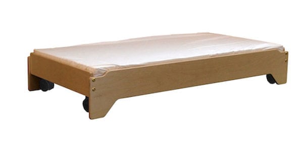 Stapelbaar rustbedje van stevig berken multiplex, voorzien van wieltjes. Wanneer de overige peuterbedjes op het bed met wieltjes geplaatst worden kunnen alle bedjes gemakkelijk verplaatst worden. Exclusief matras.