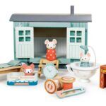 Deze herdershut is de perfecte glamping verblijfplaats voor onze nieuwe familie van muizen. Ze hebben wat snuisterijen van de grote mensen geleend om te gebruiken als essentiële meubels in hun houten trekkers hut. Een theekopje maakt een perfecte douche voor een kleine muis. Klosjes oud garen vormen stoelen om op te zitten, een blikje sardientjes is omgetoverd in een heerlijk babybedje. Een blikje doet dienst als klein houtkacheltje. Een veiligheidsspeld wordt een handdoekenrekje en een oud horloge geeft het uur van de dag aan. Dat is nog eens recyclen!