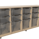 Verrijdbare lage kast inclusief 10 medium transparante bakken en 5 large transparante bakken.