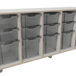 Verrijdbare lage kast inclusief 10 medium transparante bakken en 5 large transparante bakken.