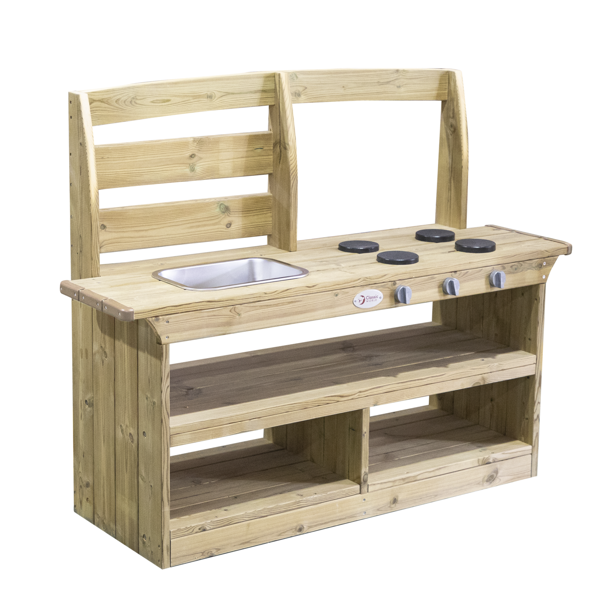 De picknicktafel is ideaal voor samen eten, knutselen of spelactiviteiten. De buitenkeuken stimuleert fantasierijk spel en laat kinderen koken en experimenteren met natuurlijke materialen. Het bijpassende opbergkastje biedt ruimte voor keukenspullen, spelmateriaal of andere benodigdheden en houdt de buitenruimte overzichtelijk.