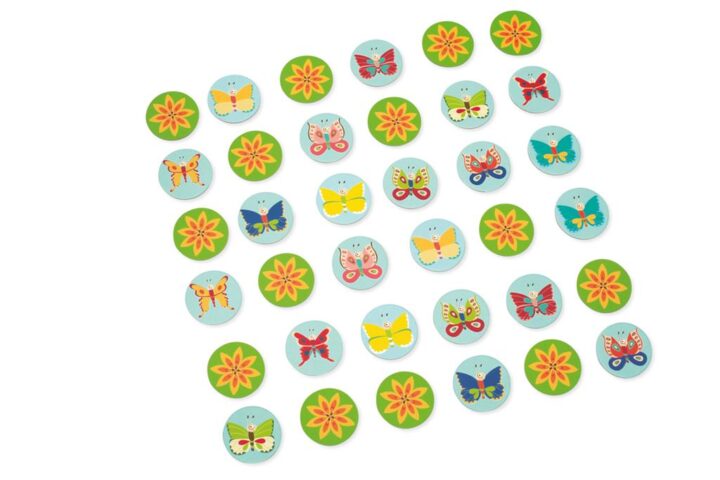 - 3. Memory: draai om de beurt twee kaarten om en verzamel als eerste alle bijpassende vlinderparen. Speel deze drie uitdagende spellen alleen of met een groep en train je kortetermijngeheugen. (32-delig, in karton)