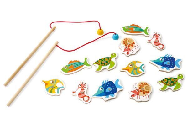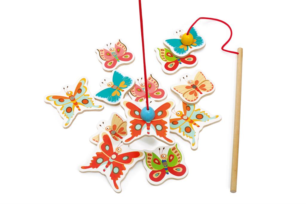 - 1. Visspel : Zwaai rond met je vlindernet om de mooiste houten vlinders te vangen met je magneetnet. Tel de verzamelde vlinders of de punten op de rug van de vlinders om erachter te komen wie er gewonnen heeft! 12 vlinders met punten (magnetisch, in hout) en 2 hengels (magnetisch, in hout),