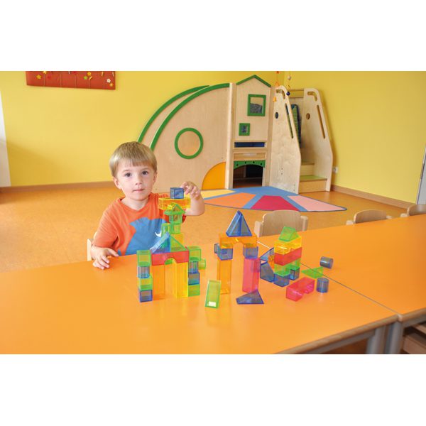 De transparante blokken nodigen de kinderen uit om een felgekleurd gebouw en kleurrijke patronen op de lichte tafel uit te vinden. Dit leidt de fijne motoriek op en de kinderen hebben hun eerste wiskundige ervaringen. Elke set bestaat uit 36 kubussen in 4 kleuren. Inclusief een praktische stapelbak met klemdeksel.