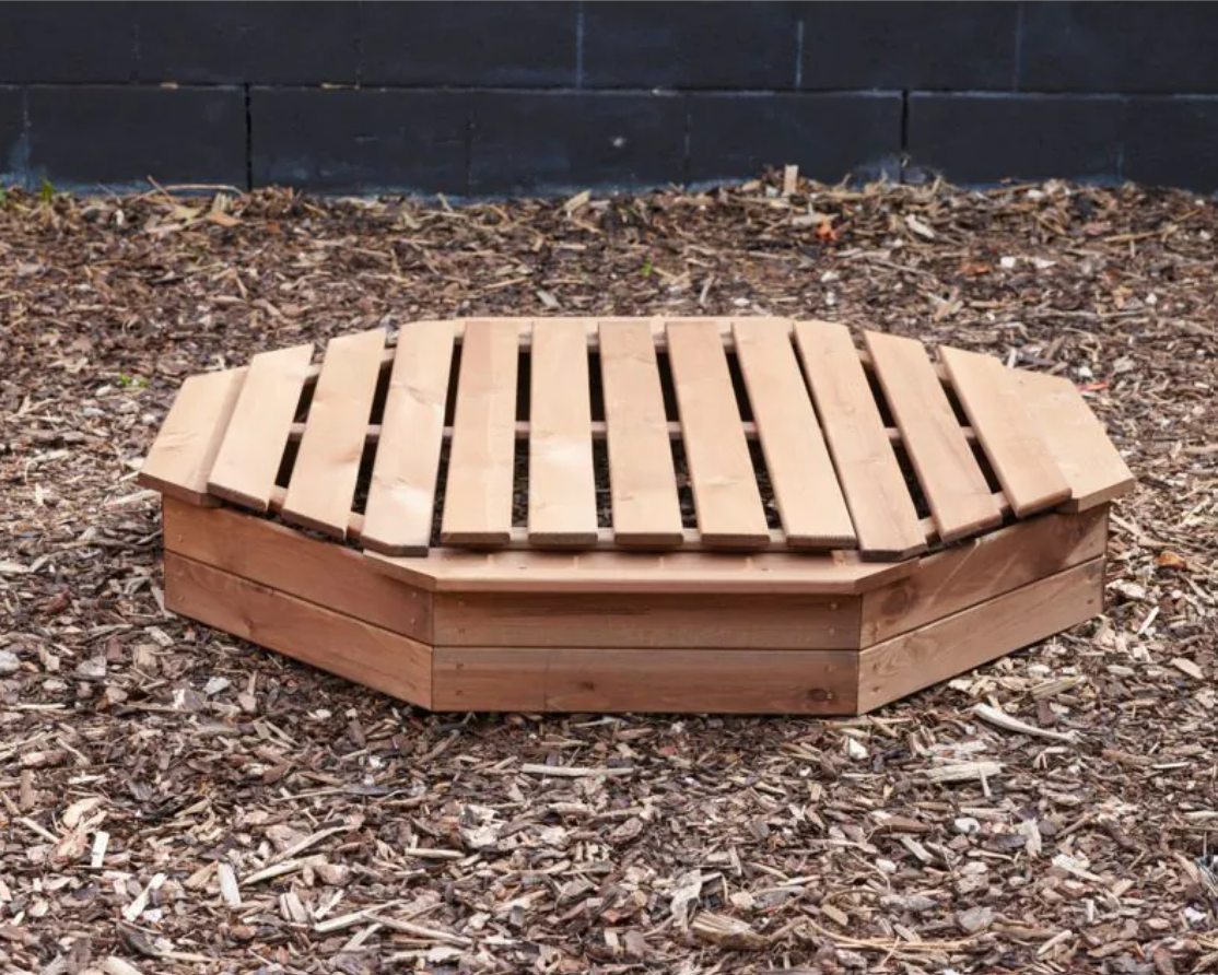 Een ruimtebesparende houten, achthoekige zandbak met geïntegreerde zitbanken en een lichtgewicht driedelige houten afdekking.