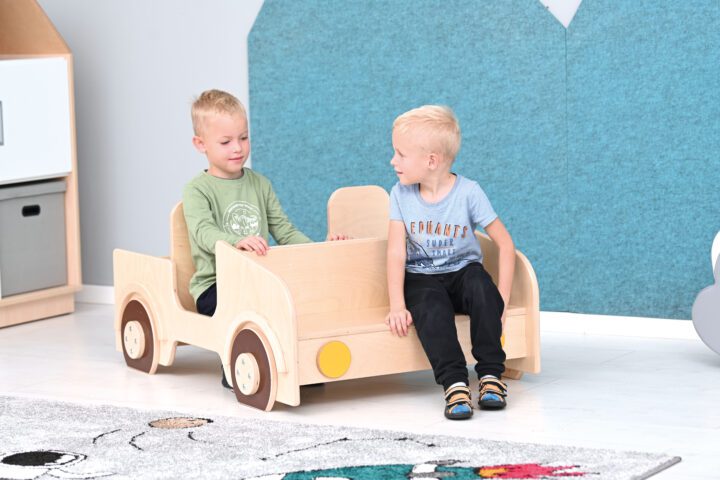 Deze mooi afgewerkte auto is een prachtige toevoeging aan de speelruimte in de kinderopvang. Kinderen zitten graag achter het stuur, met hun vriendjes ernaast en achterin. De auto biedt veel zitruimte, een beweegbaar doolhof, een pieper en een stuurwiel.