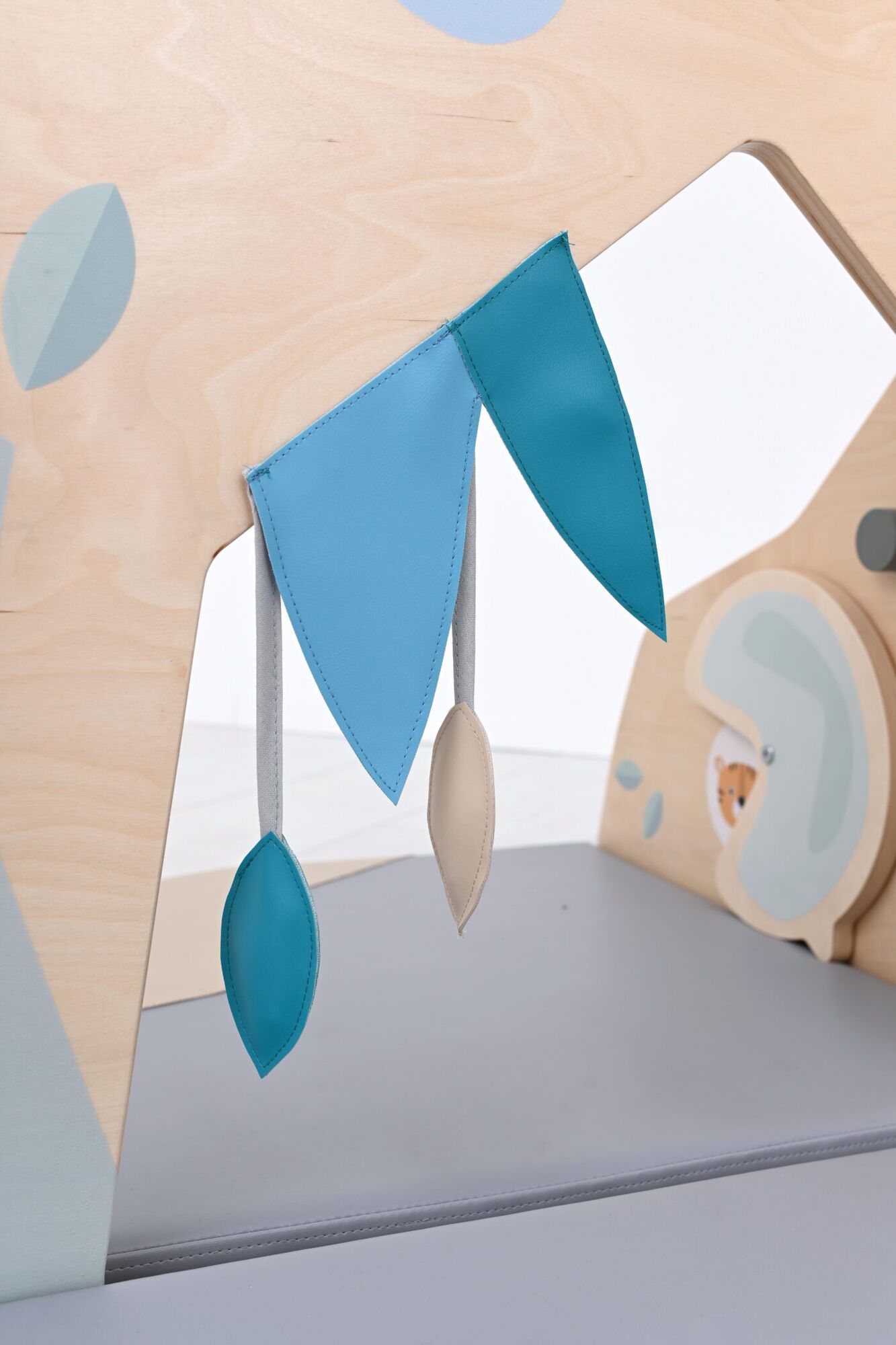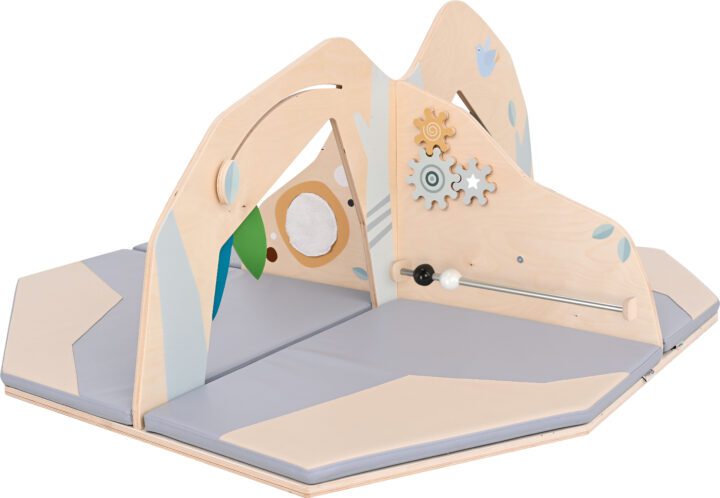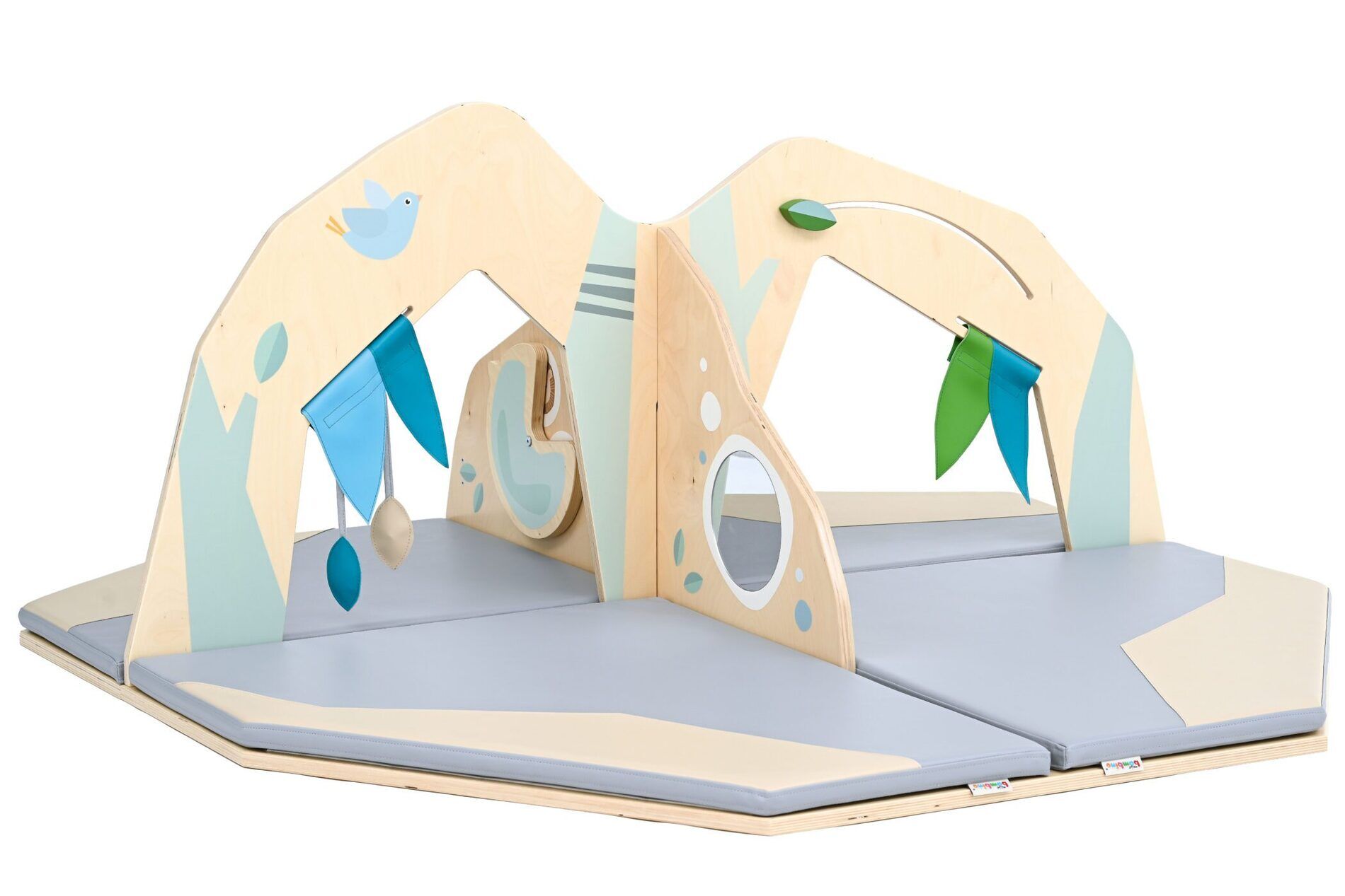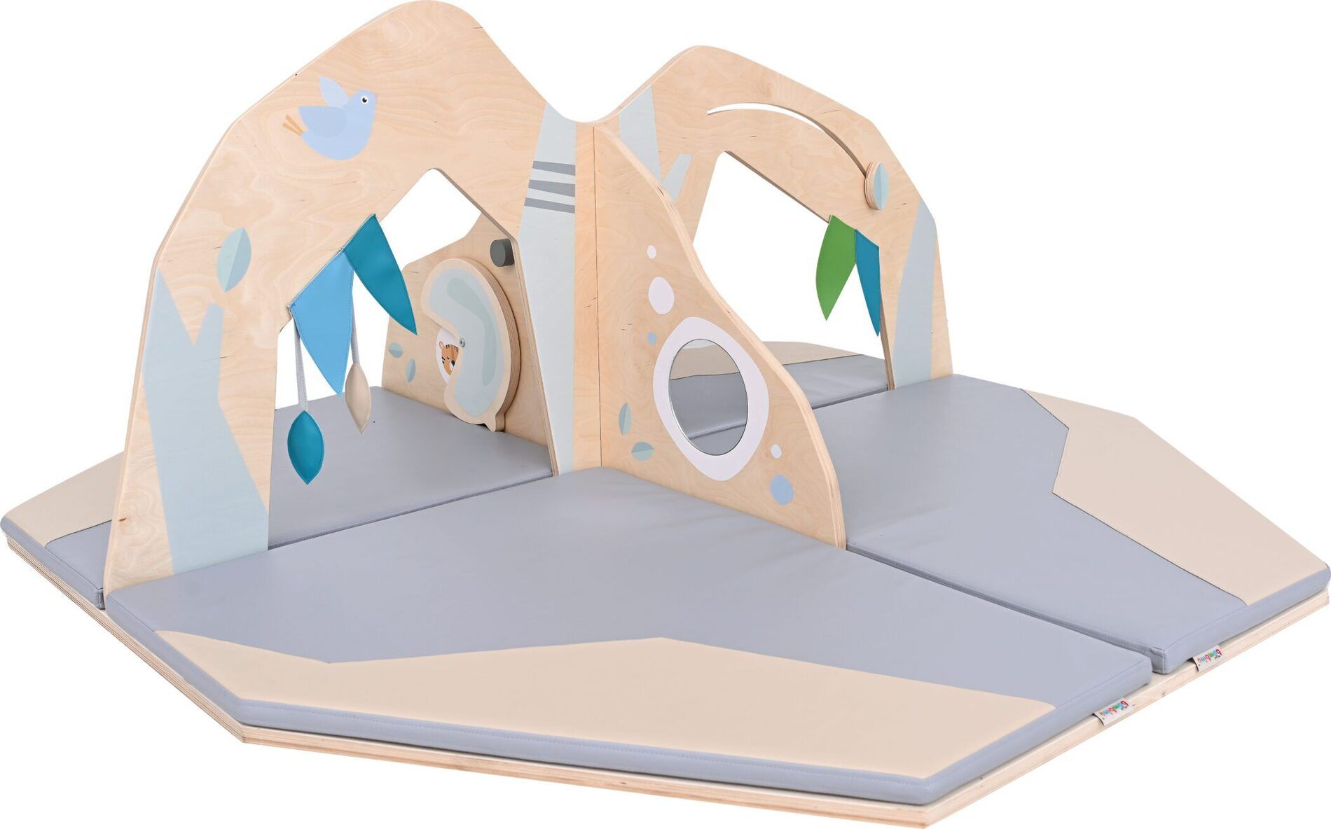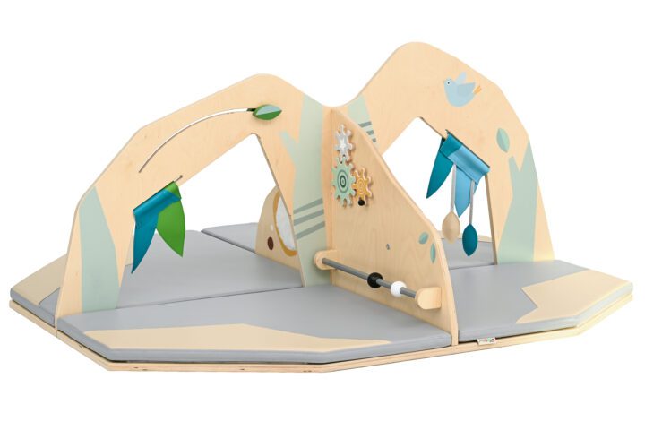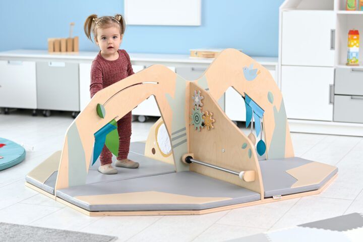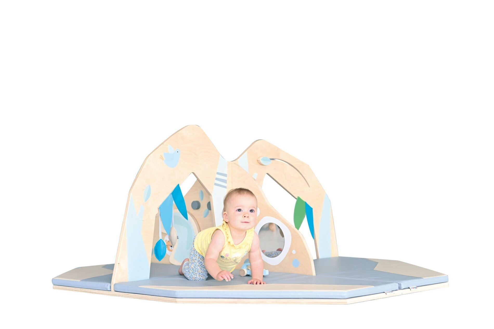 Dit is een waar speelparadijs voor de jongste kinderen in de opvang. Deze vierzijdige speelhoek is uitgerust met elementen zoals een kindveilige spiegel, beweegbare doolhoven, tandwielen, wit bont en matrassen. De tussenschotten zijn gemaakt van multiplex (dikte: 18 mm) met kleurrijke prints.