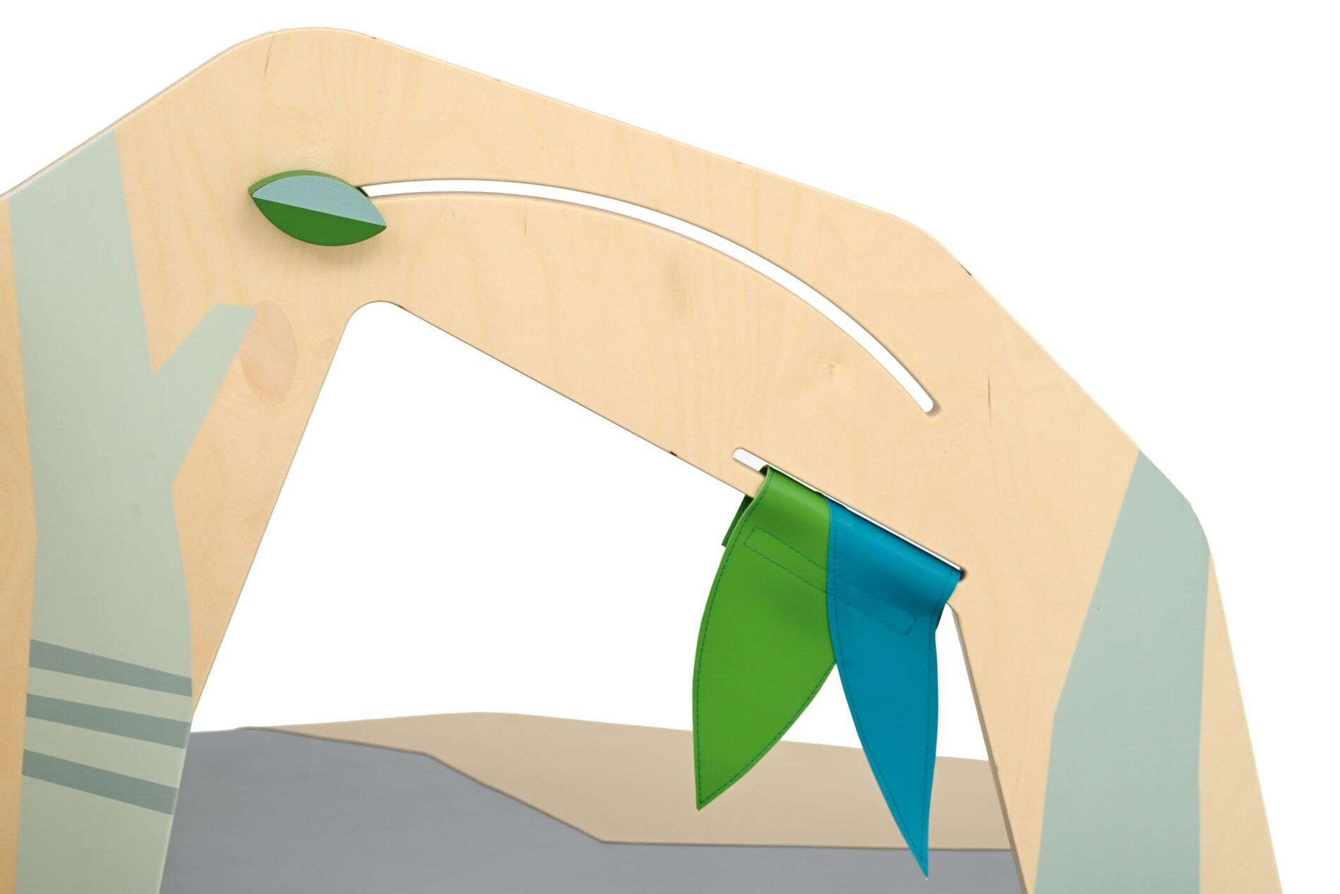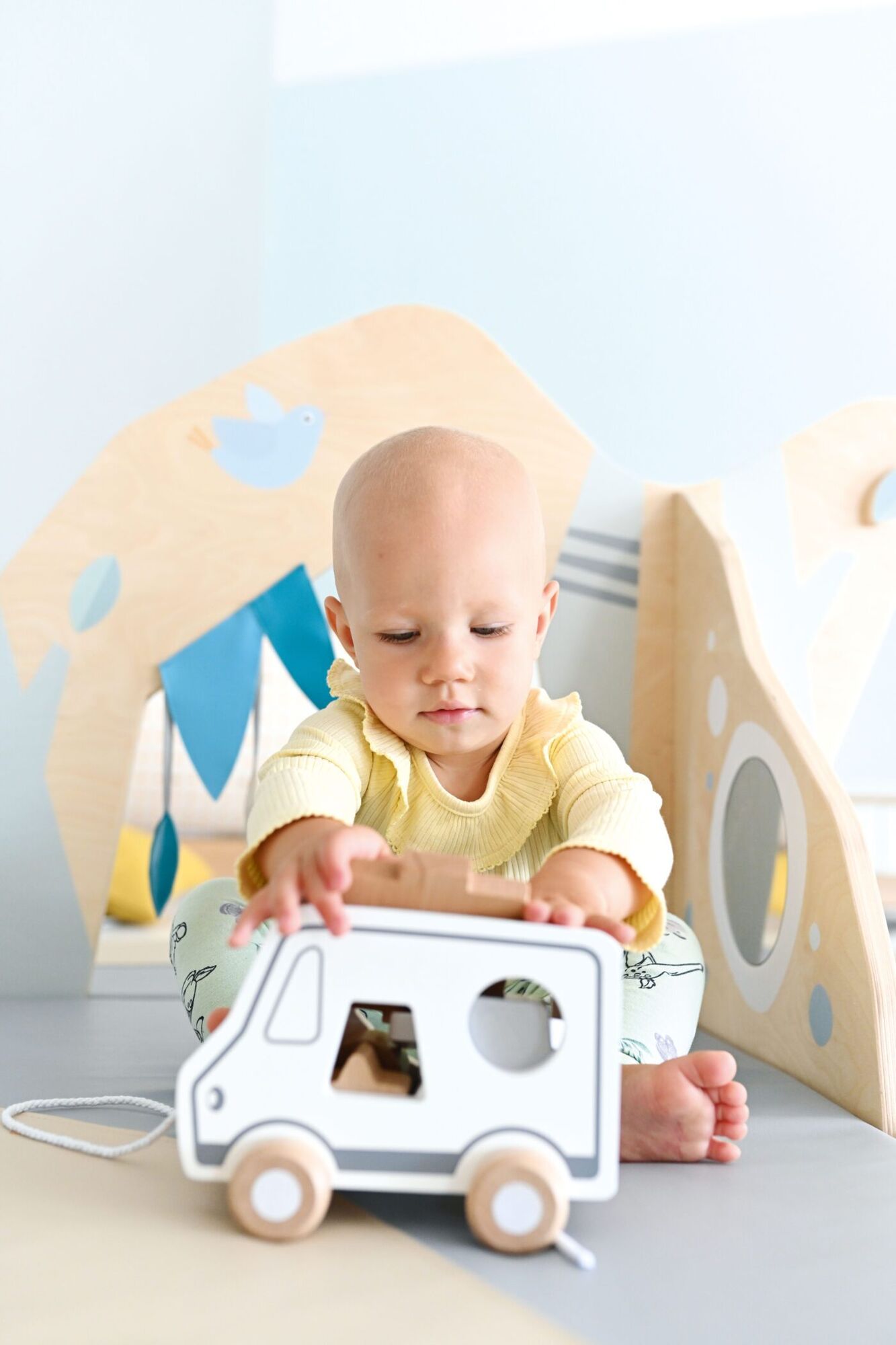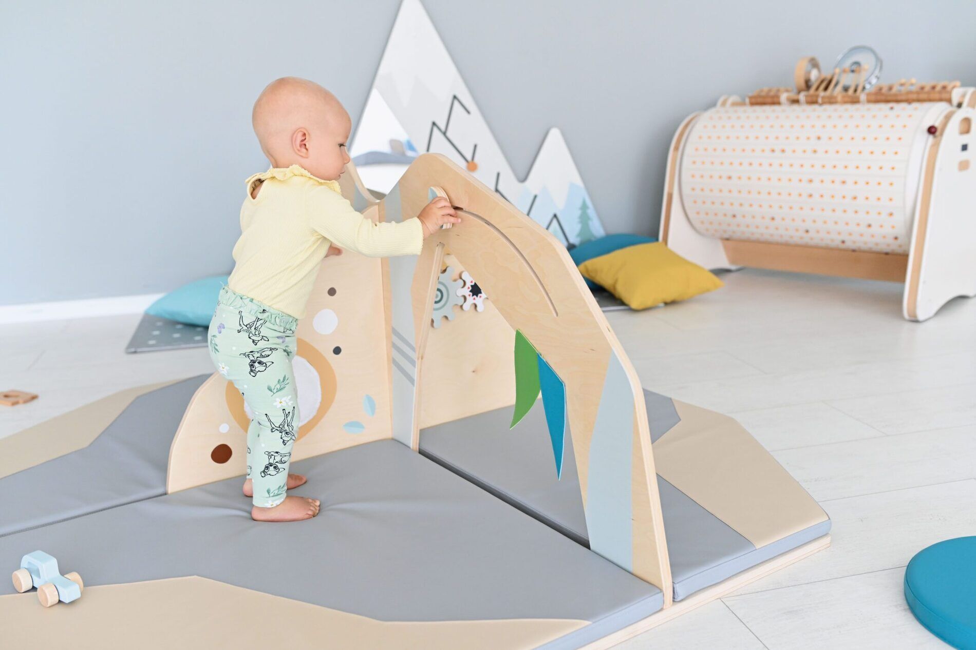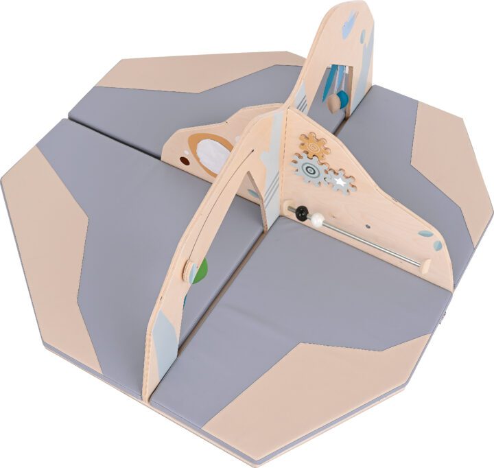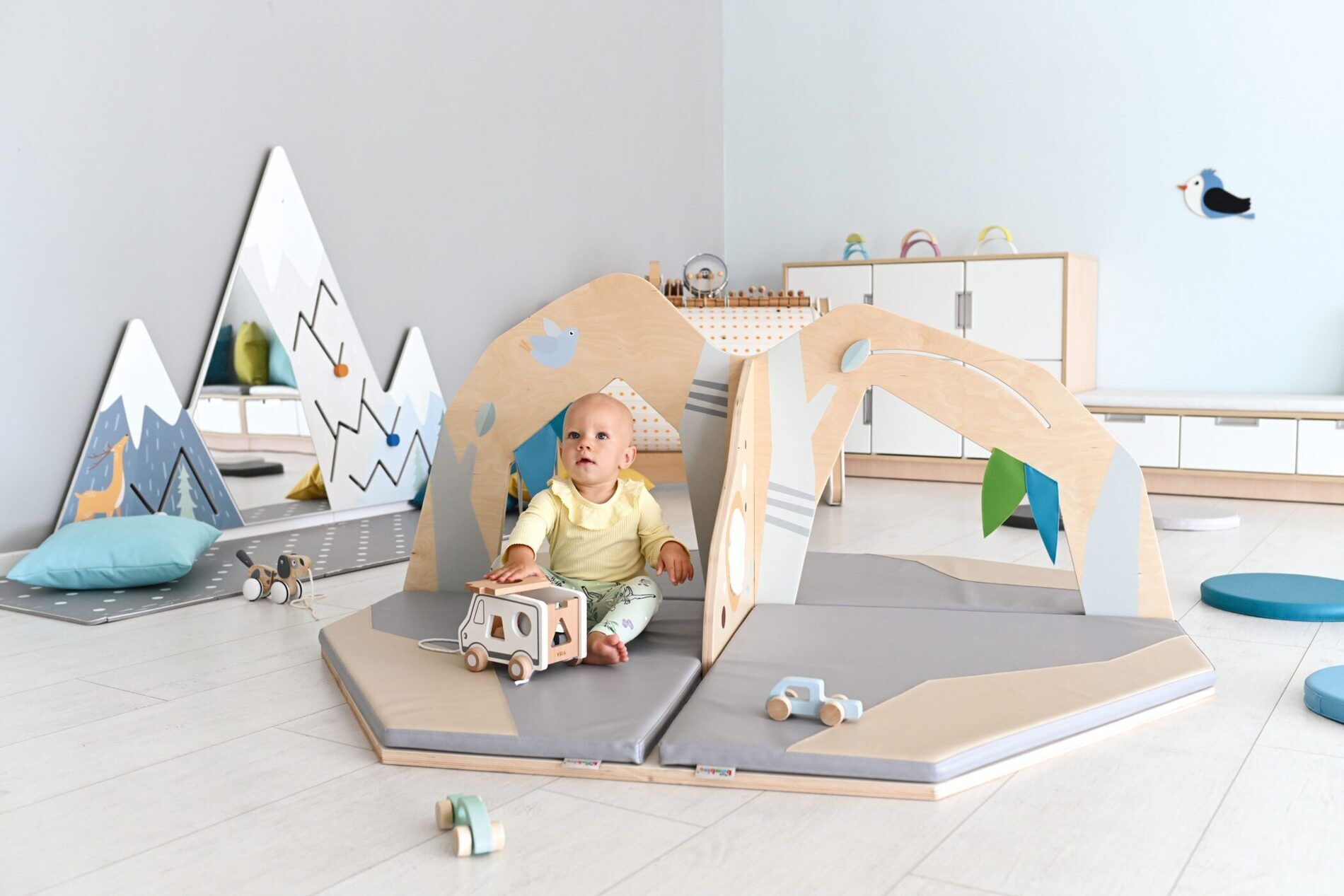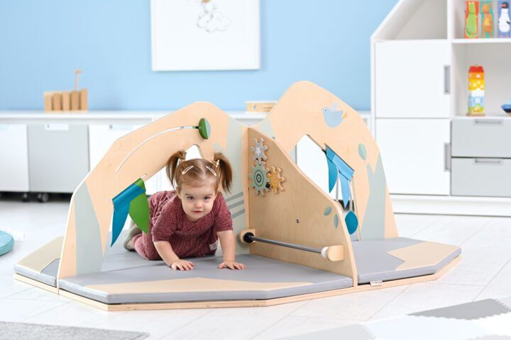 Dit is een waar speelparadijs voor de jongste kinderen in de opvang. Deze vierzijdige speelhoek is uitgerust met elementen zoals een kindveilige spiegel, beweegbare doolhoven, tandwielen, wit bont en matrassen. De tussenschotten zijn gemaakt van multiplex (dikte: 18 mm) met kleurrijke prints.
