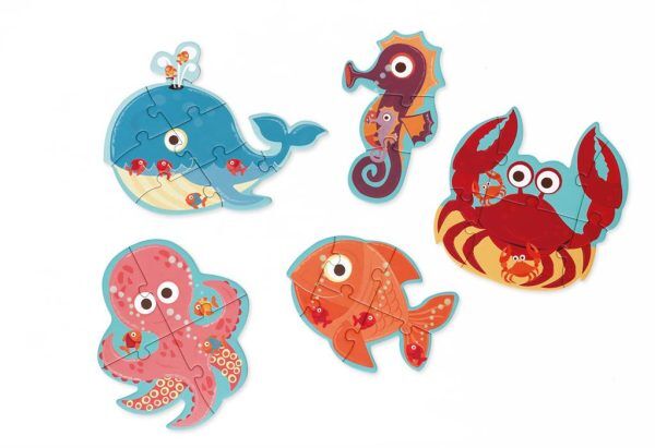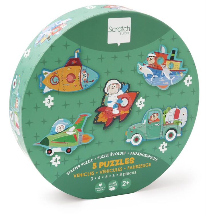 - Vijf vrolijke voertuigen om samen te stellen: zeppelinpuzzel (3 puzzelstukken), straaljagerpuzzel (4 puzzelstukken), raketpuzzel (5 puzzelstukken), bootpuzzel (6 puzzelstukken) en autopuzzel (8 puzzelstukken).