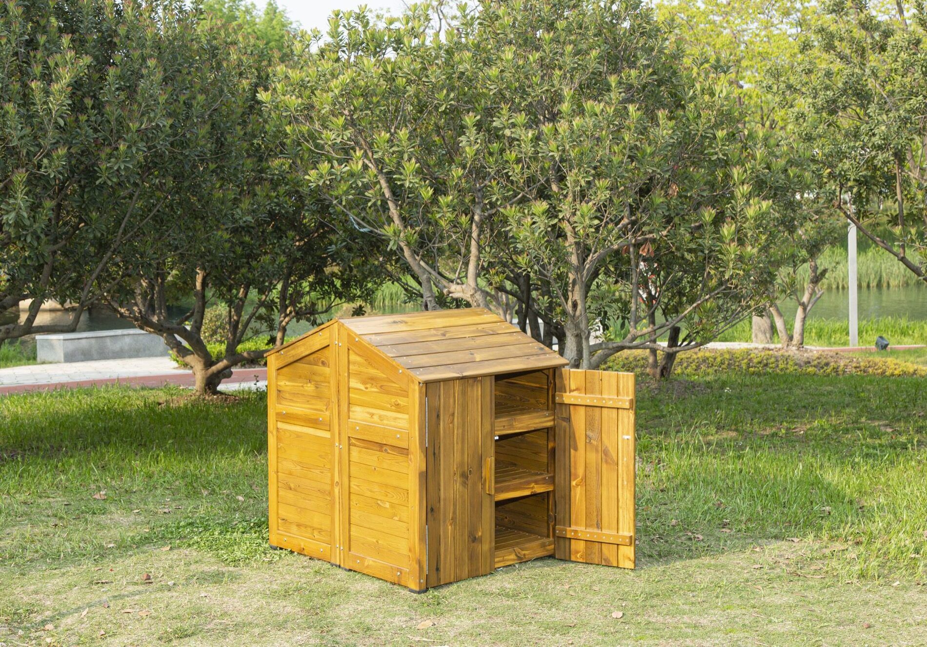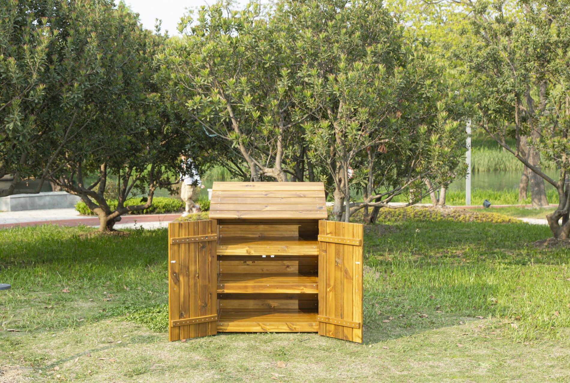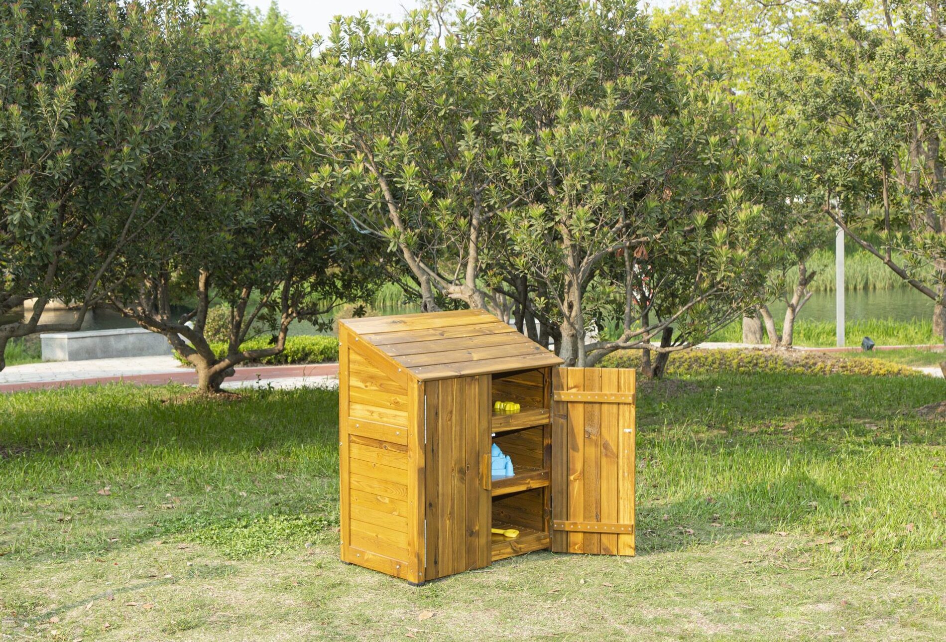 De vakken bieden voldoende ruimte voor een verscheidenheid aan items en zorgen voor eenvoudige organisatie. Met twee deuren is de kast gemakkelijk te openen en te sluiten, waardoor de toegang tot de items wordt vergemakkelijkt en de veiligheid wordt gegarandeerd. Deze kast is praktisch en aantrekkelijk ontworpen. Met zijn natuurlijke houtkleur en zorgvuldige afwerking is deze kast een blikvanger en past hij naadloos in elke buitenomgeving.