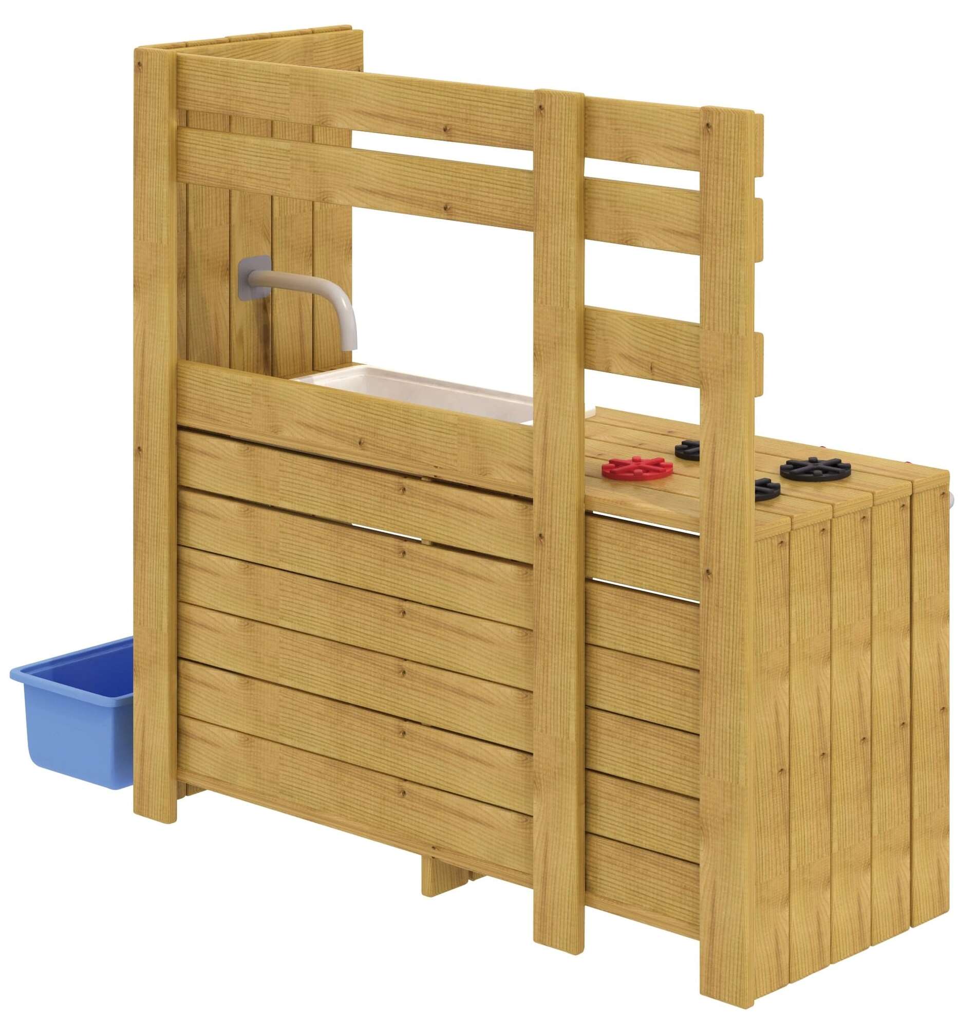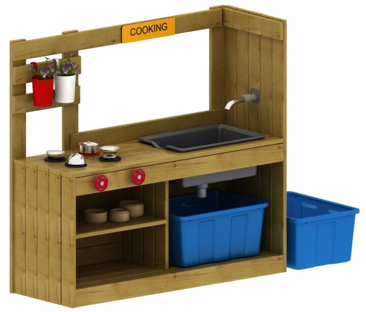 ⦁ Inhoud: buiten speelkeuken, pomp, 2 lekbakken, gootsteen, waterkraan, kookplaten.