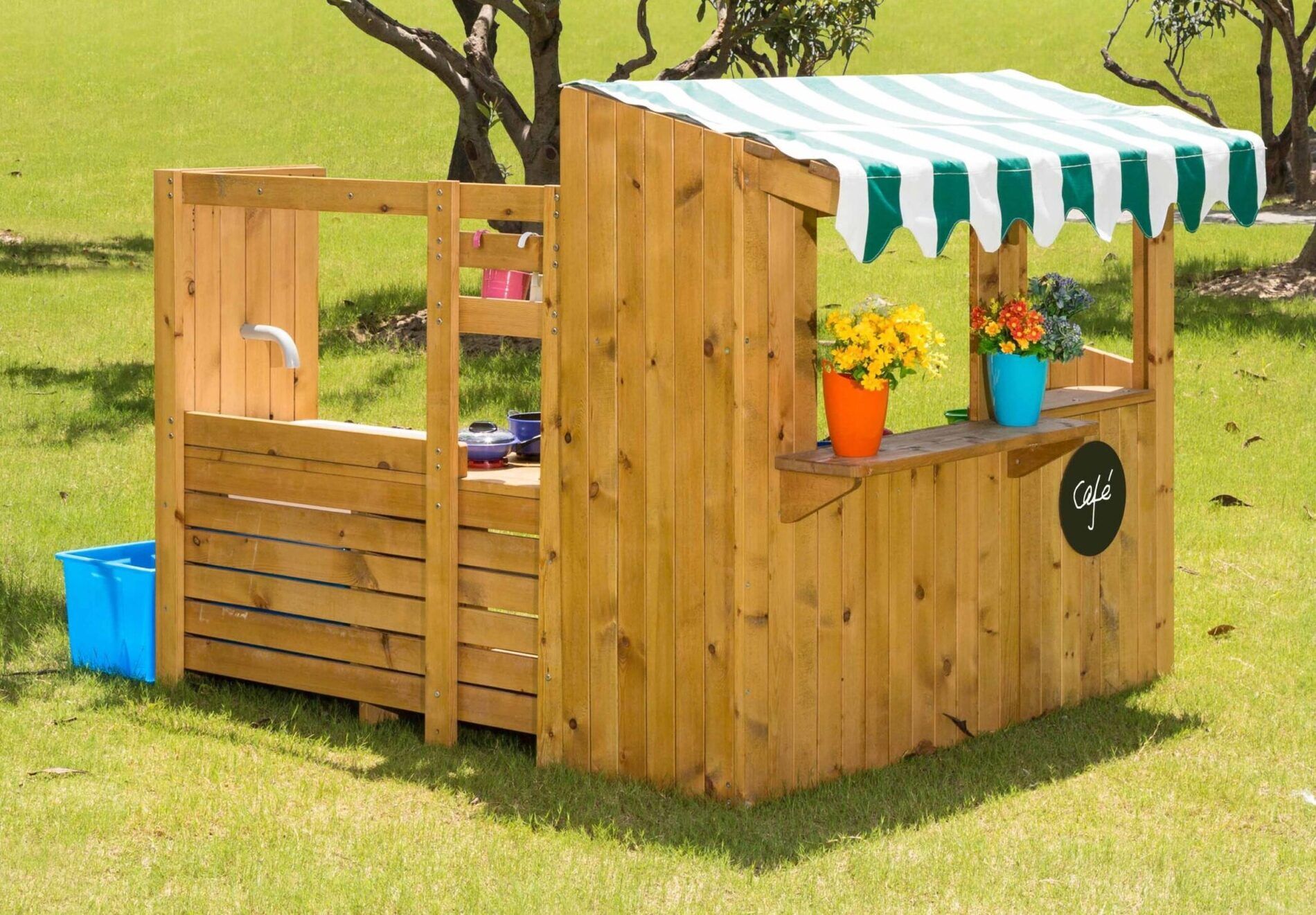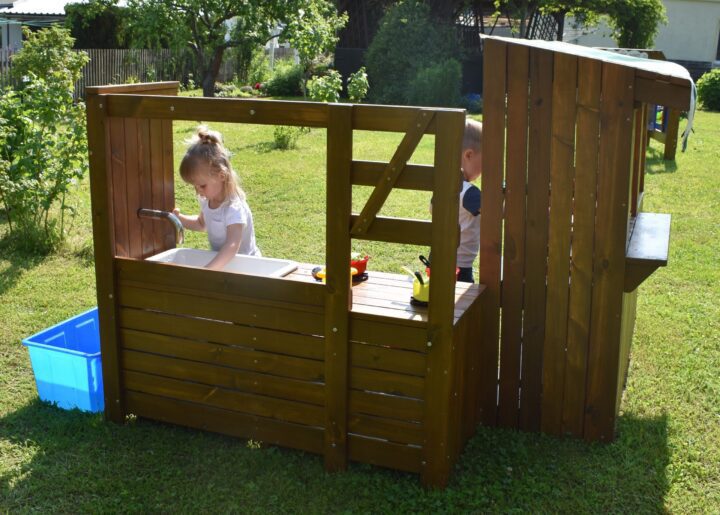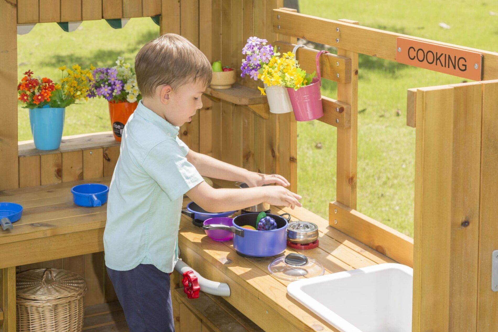 Deze buitenkeuken is een ware toevoeging aan jullie buitenspeelplaats! Laat de kinderen in de gezonde buitenlucht lekker koken en bakken. De keuken bevat geweldige accessoires en dankzij de geïntegreerde functionele pomp hebben de kinderen zelfs stromend water. Voer het water wel elke dag af na het spelen.