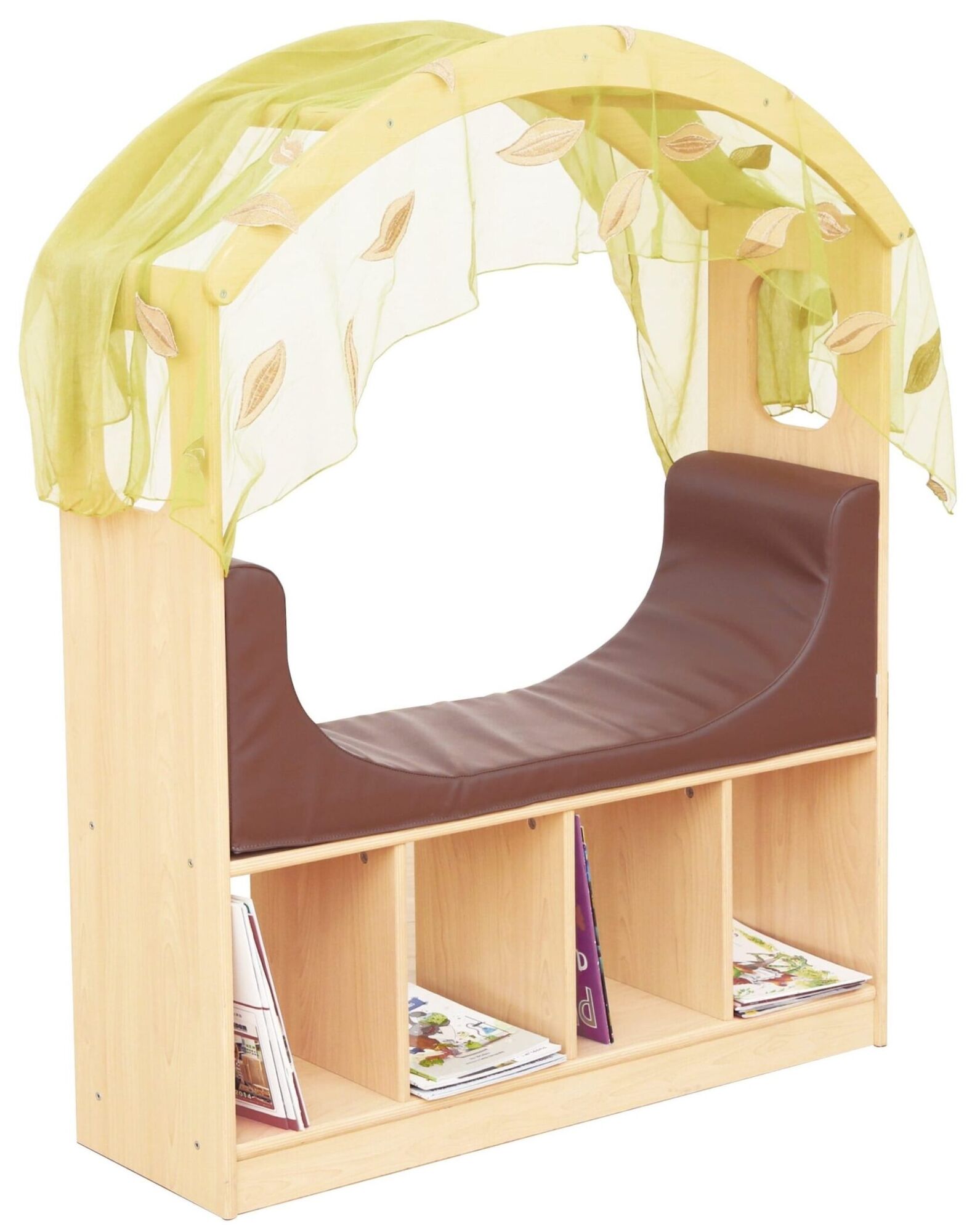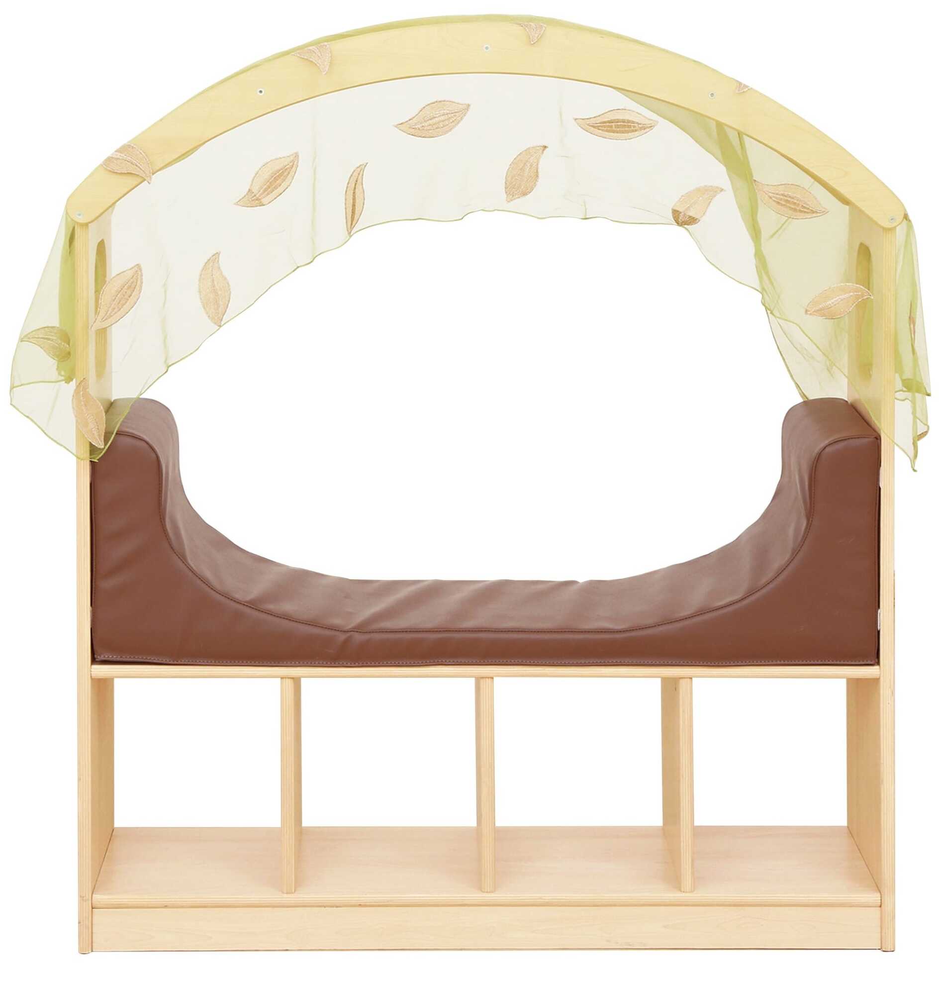 Er is veel opbergruimte voor boeken en speelgoed. De hoogte van de zitting of het liggedeelte is ongeveer 45 cm, gemaakt van schuim en kunstleer en biedt voldoende ruimte. Het stoffen dak dat erbij wordt geleverd voegt een gezellige charme toe. De Chill- en leeshoek past zich volledig aan de kameromstandigheden aan en kan tegen de muur worden geplaatst of als ruimteverdeler worden gebruikt.