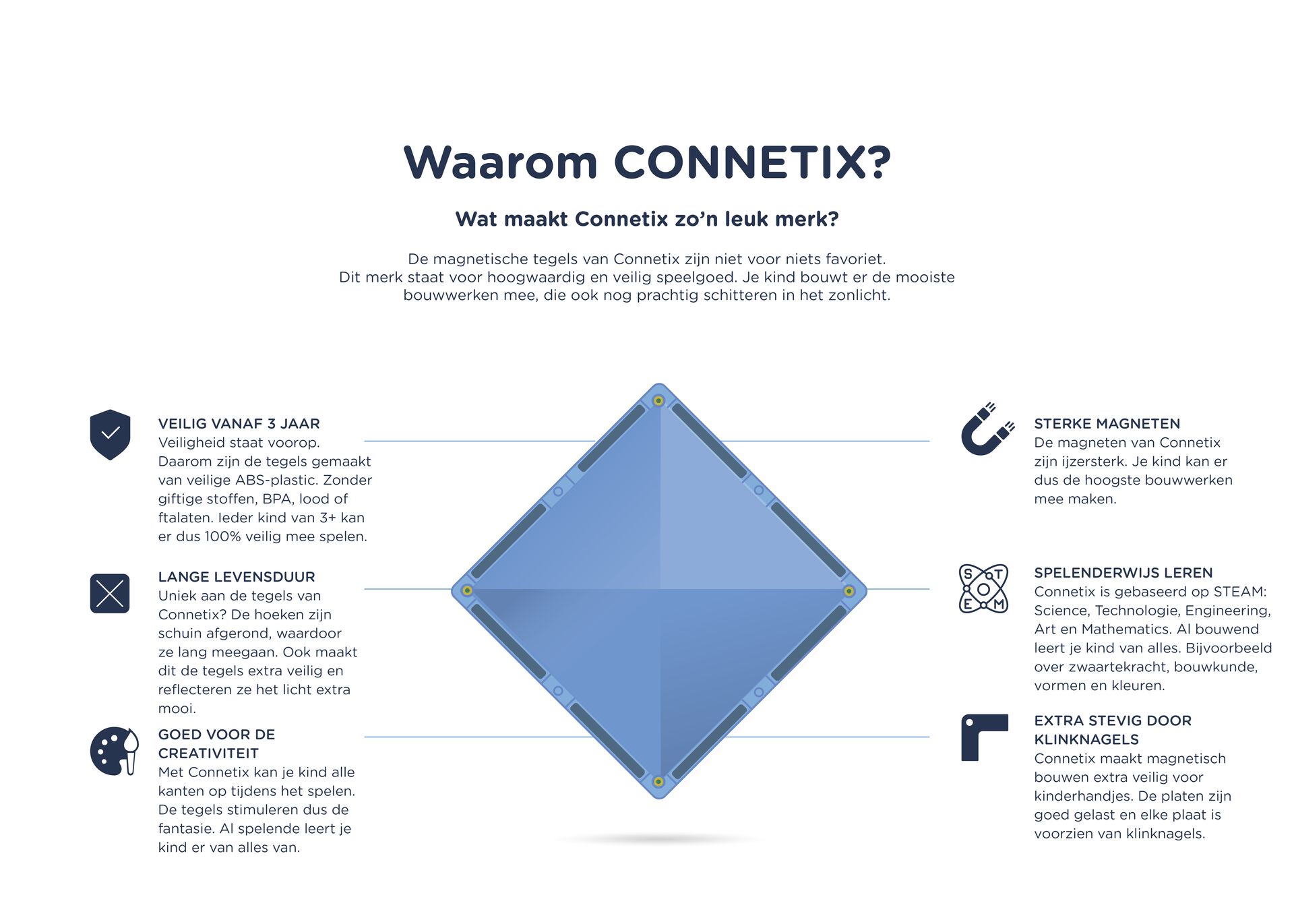 Dankzij het unieke afgeschuinde ontwerp zijn Connetix sterk en bieden ze tegelijkertijd prachtige heldere lichtbrekingen.