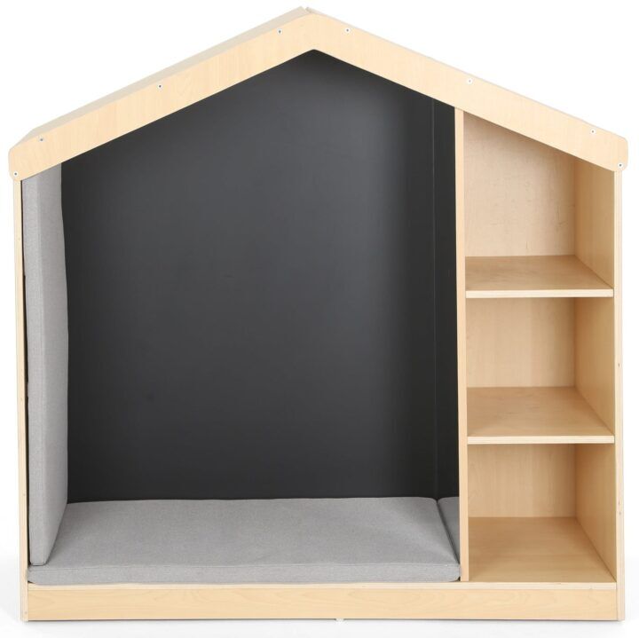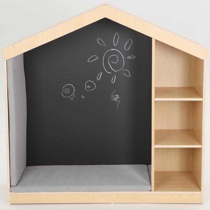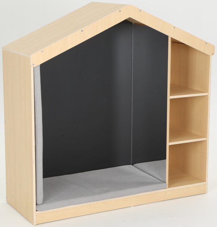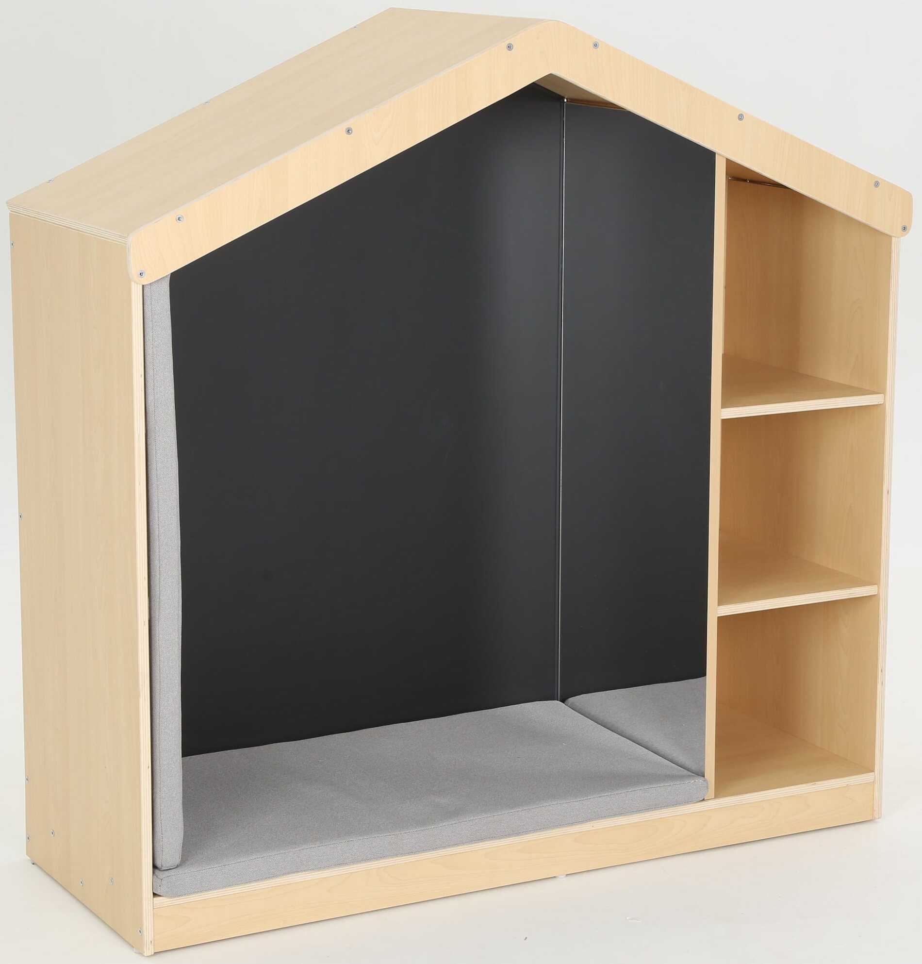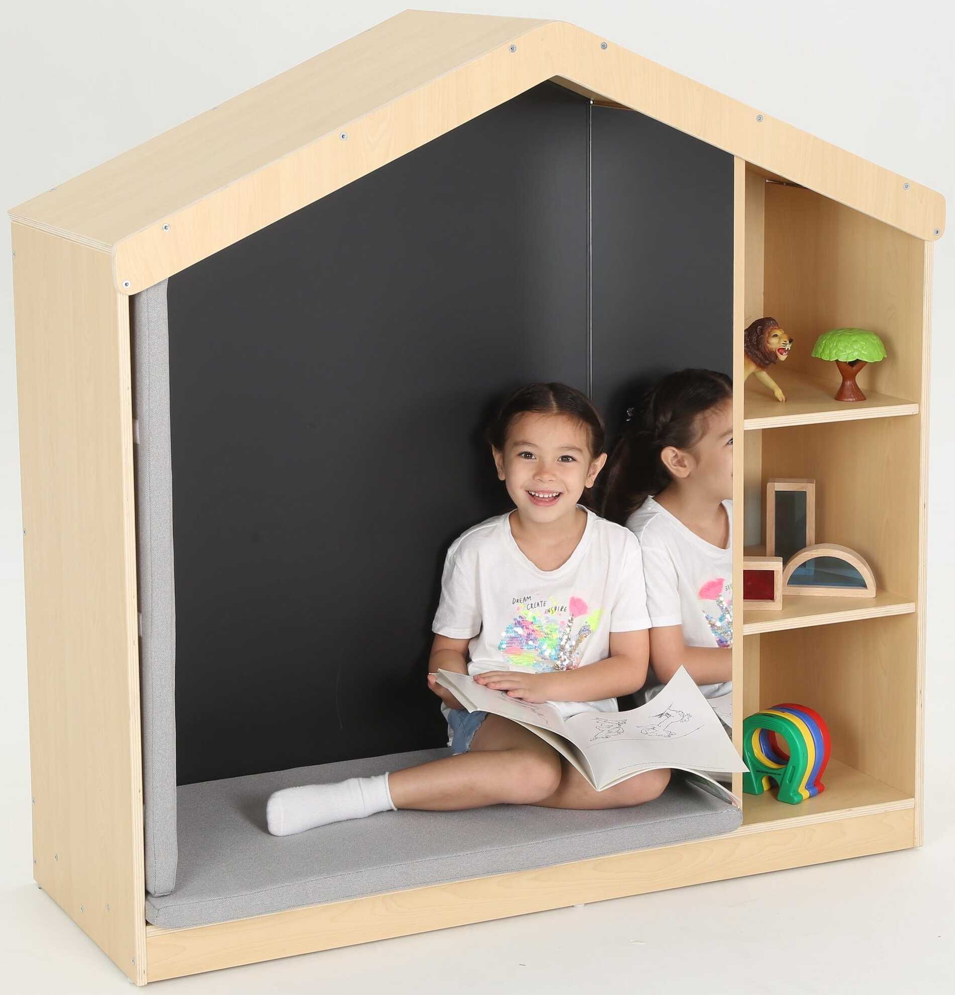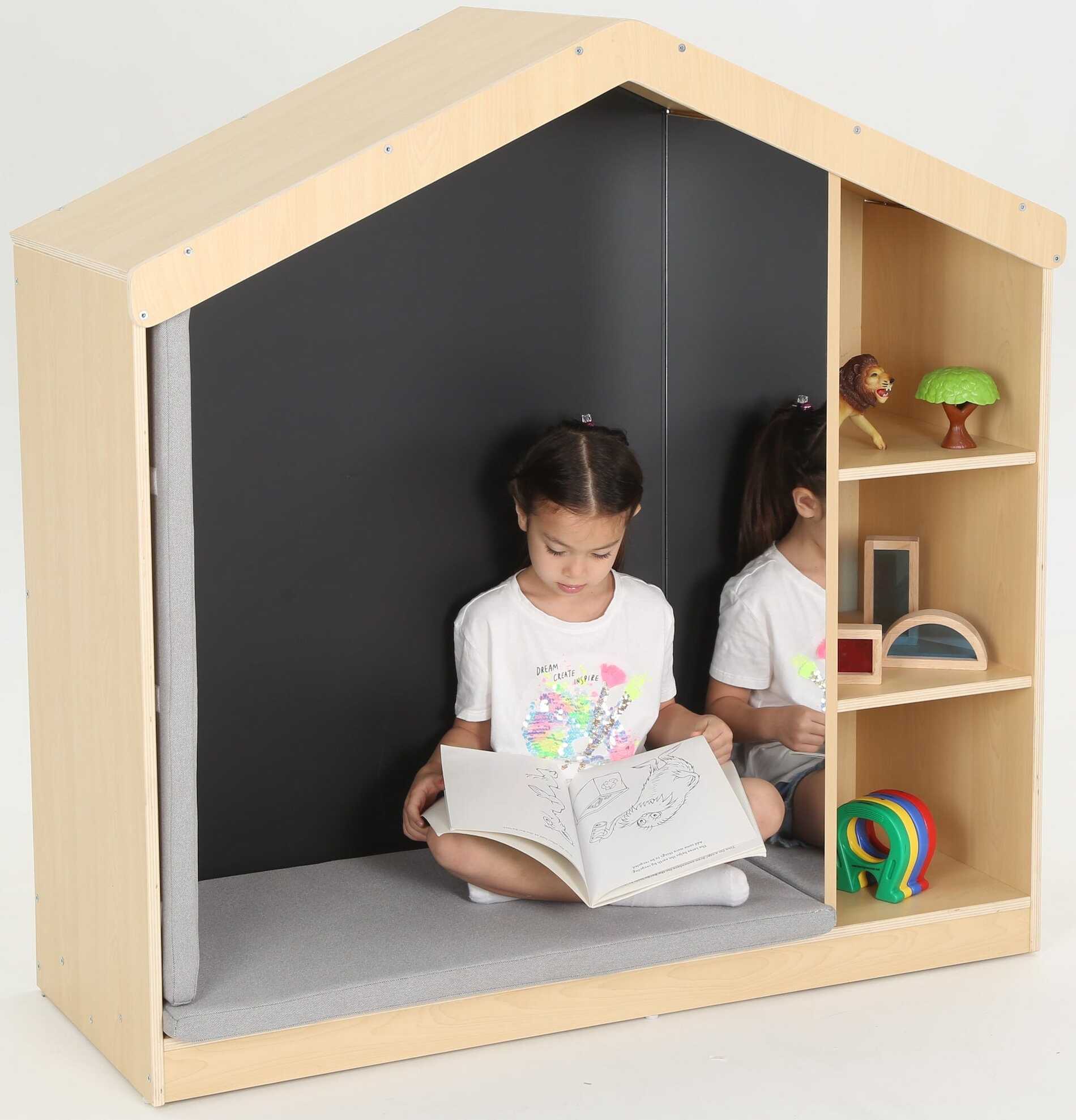 Dit huisje is een heerlijk plekje voor kinderen om zich terug te trekken. De kinderen lezen een boekje, tekenen op het krijtbord of ontdekken zichzelf in de spiegel, dit knusse huisje biedt kinderen alle ruimte voor ontdekking en creativiteit.