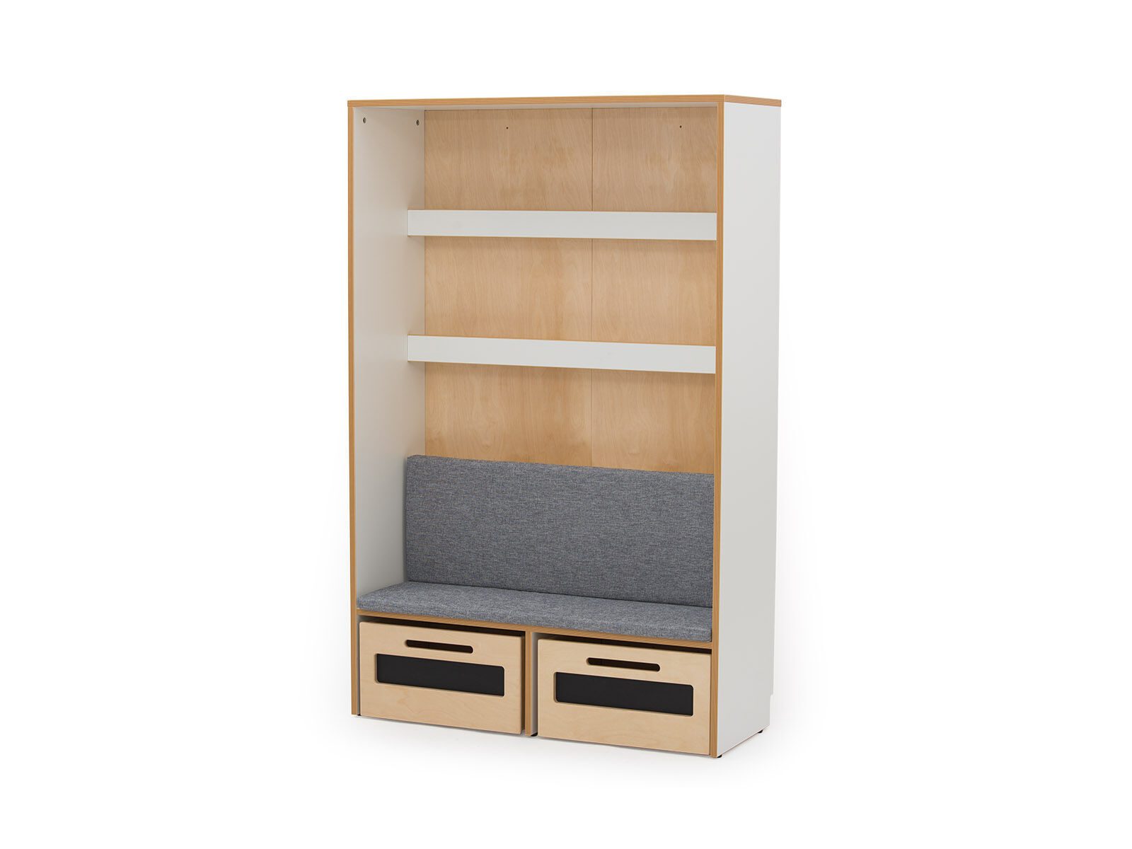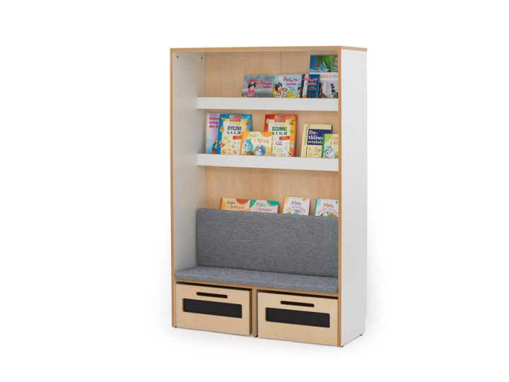 deze kast biedt alles wat de leeshoek in jullie kinderopvang nodig heeft: zitruimte, opbergruimte en leesplanken.