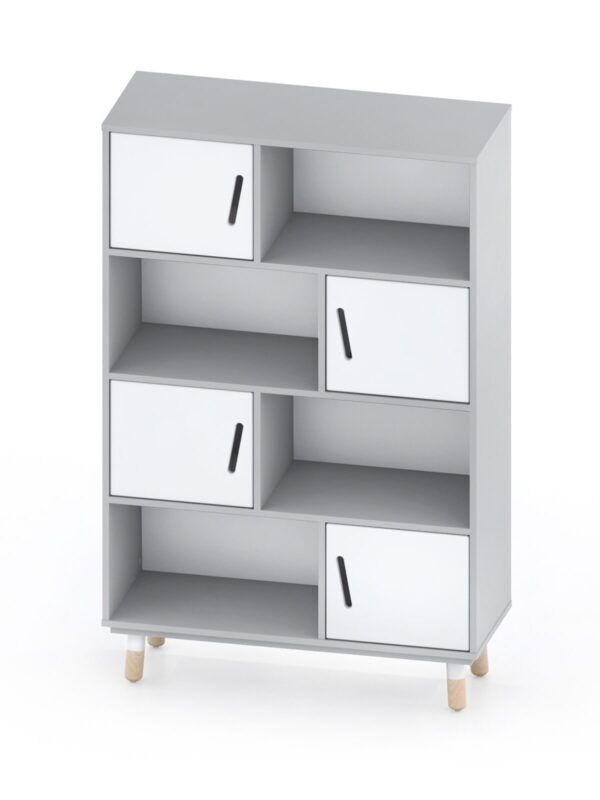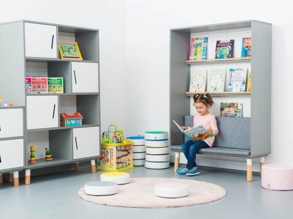 De romp van de boekenkast is gemaakt van grijs gelamineerde spaanplaat. Onder de boekenkast zitten naturelkleurige beuken poten en poten met witte stalen bevestiging. De zitting van de boekenkast bestaat uit een matras met een dikte van 3 cm, afgezet met grijs, vlekbestendig materiaal