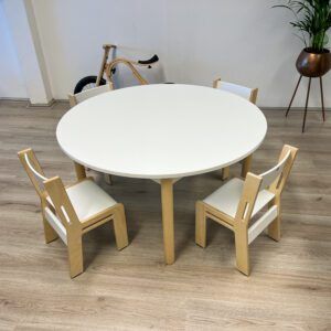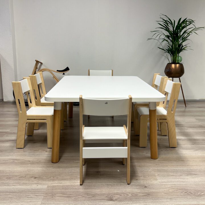 Deze kindertafel van houten poten met wit tafelblad is een must in de moderne kinderopvang en peuterspeelzaal.