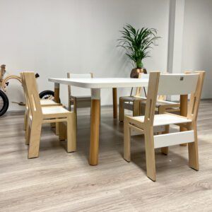 Deze kindertafel van houten poten met wit tafelblad is een must in de moderne kinderopvang en peuterspeelzaal.
