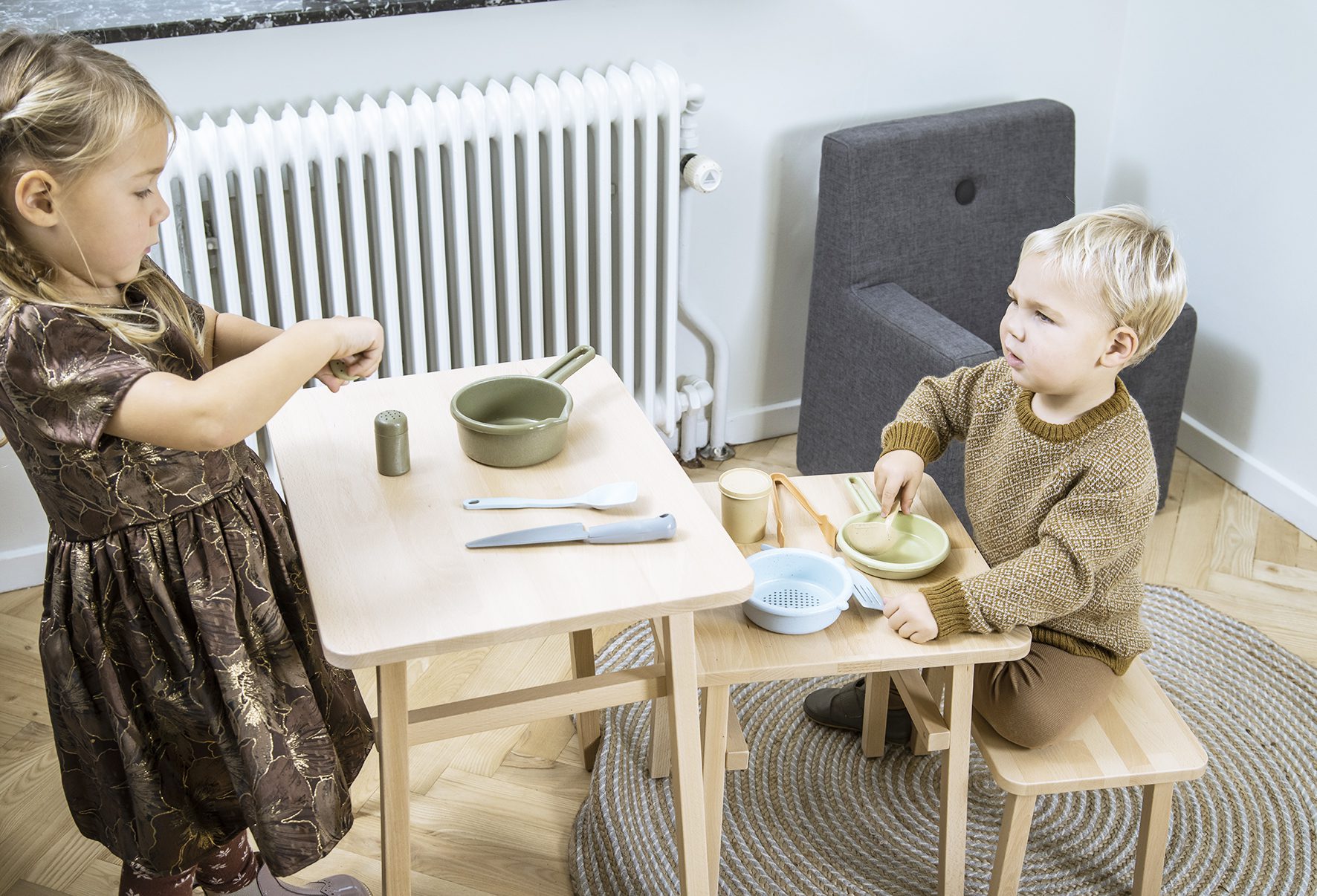 Keukenset met potten, pannen en accessoires in heerlijke trendy kleuren, gemaakt van Nordic Swan Ecolabelled bioplastic.