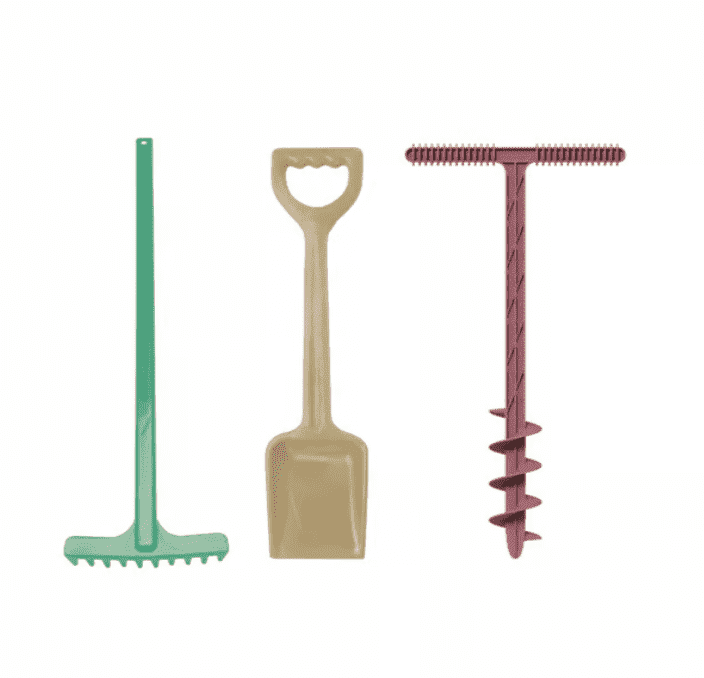 De set bestaat uit een hark, schep en zandboor en zal jongere en oudere kinderen vermaken en uitdagen, terwijl de motoriek en graaftechnieken worden verbeterd. Vorm golvende patronen met de hark, tunnel diep in het zand met de boor en graaf holen uit met de schep.