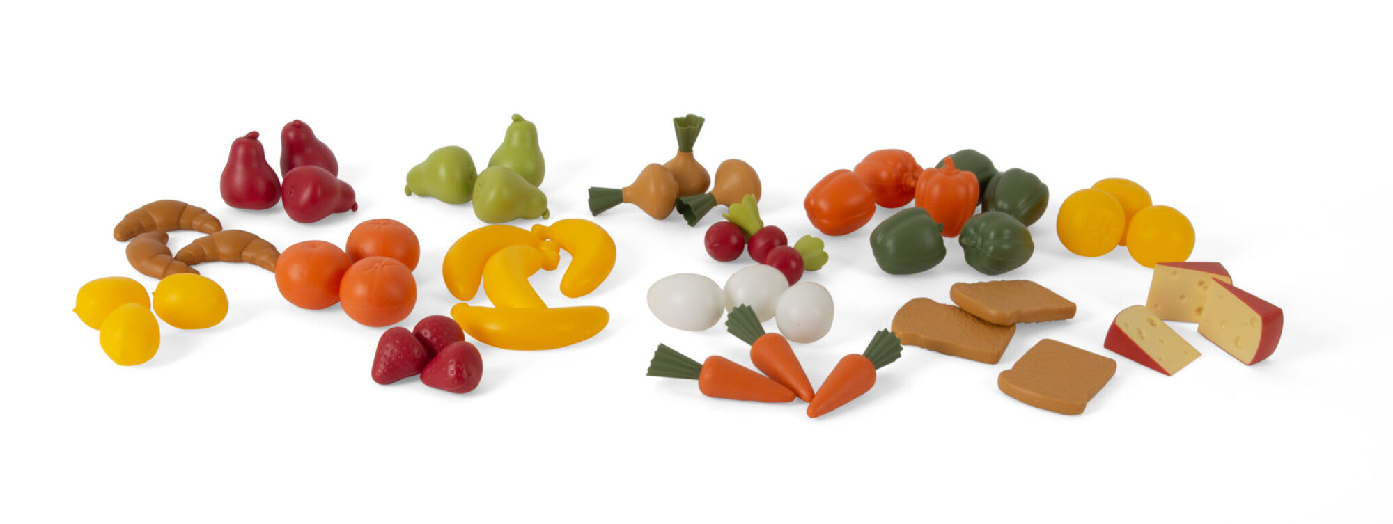 Met deze grote voedselset van 50 onderdelen kunnen kinderen eindeloos koken, serveren en fantaseren. De set bevat verschillende soorten speelvoedsel zoals brood, kaas, groenten, eieren en fruit, waarmee kinderen steeds nieuwe maaltijden kunnen samenstellen.