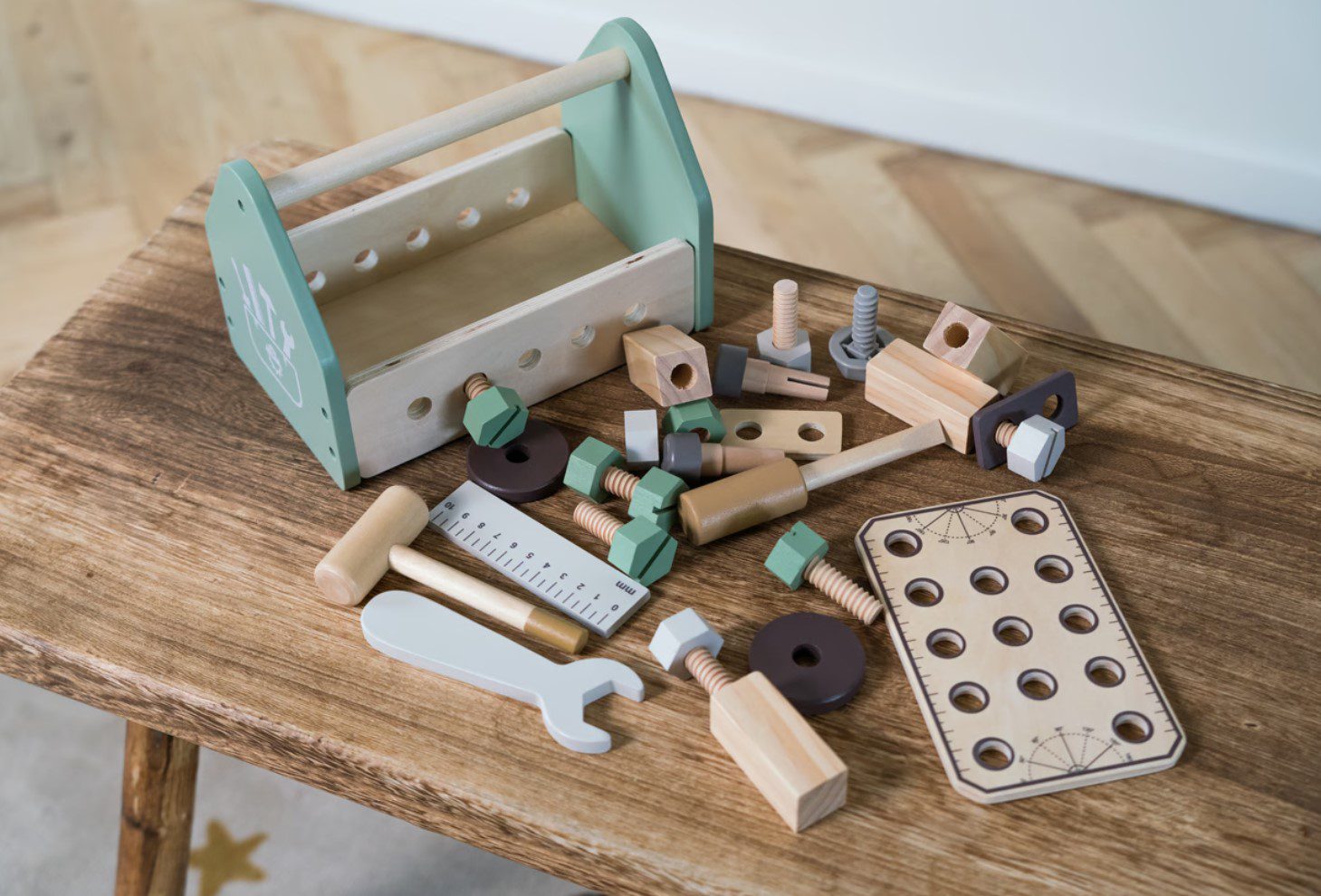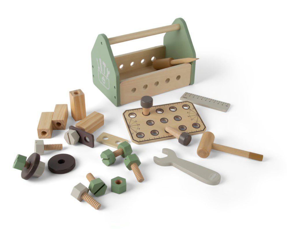 Met een prachtige combinatie van natuurlijk hout en turquoise accenten bevat de gereedschapskist alle benodigde tools voor urenlang creatief speelplezier. Kinderen kunnen schroeven, hameren, meten en bouwen – niet alleen leuk, maar ook goed voor de ontwikkeling van belangrijke vaardigheden. De gereedschappen zijn speciaal ontworpen voor kleine kinderhanden en zijn daardoor makkelijk en veilig in gebruik.