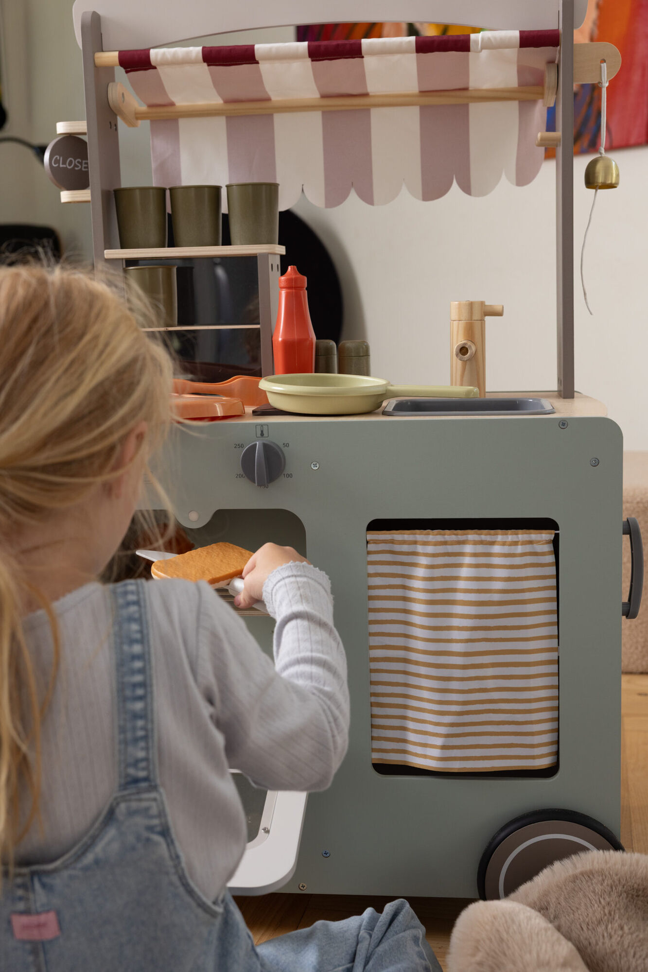 De keuken biedt alles wat jonge chefs nodig hebben: een oventje voor mini-pizza’s, een spoelbak voor groenten en een kookplaat voor het gerecht van de dag. Op het menu kan van alles staan: ijsjes, pannenkoeken, hamburgers of andere zelfbedachte lekkernijen. Onder de gestreepte luifel met het bord “Street Food” kunnen kinderen hun eigen kraampje runnen en hapjes serveren aan klanten zoals knuffels, ouders of broertjes en zusjes.