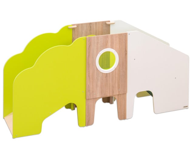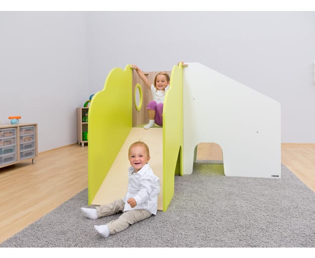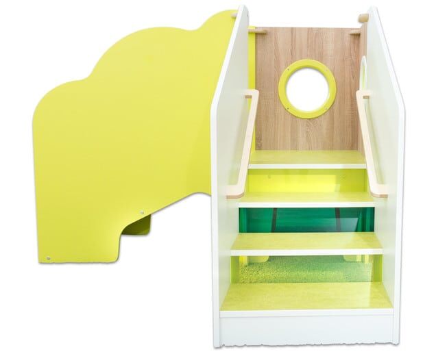 Met de glijbaan en de trap is dit het hoogtepunt voor alle kinderen. Het kan worden gebouwd in kleine ruimtes om ruimte te besparen over de hoek of gewoon rechtdoor met een ander speelvlak erboven. Het biedt dus voldoende ruimte om te verbergen en te spelen. Het groene acrylglas op de trap verlicht op magische wijze de kruipende grotten onder het speeltoestel. De trap met zijn leuning aan beide zijden is al geschikt voor de kleintjes en zacht bekleed met het bewerkte tapijt voor kleine valpartijen.