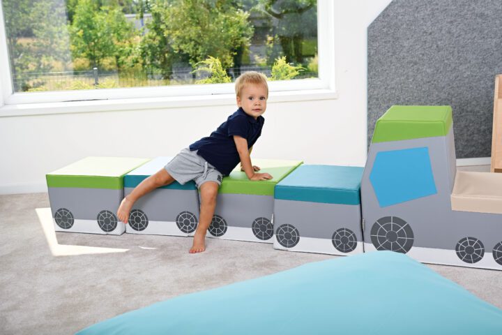 Deze unieke trein bestaat uit 4 poef-wagons en een locomotief. De kinderen vinden het prachtig en het is een echte eye-catcher in de kidneropvang