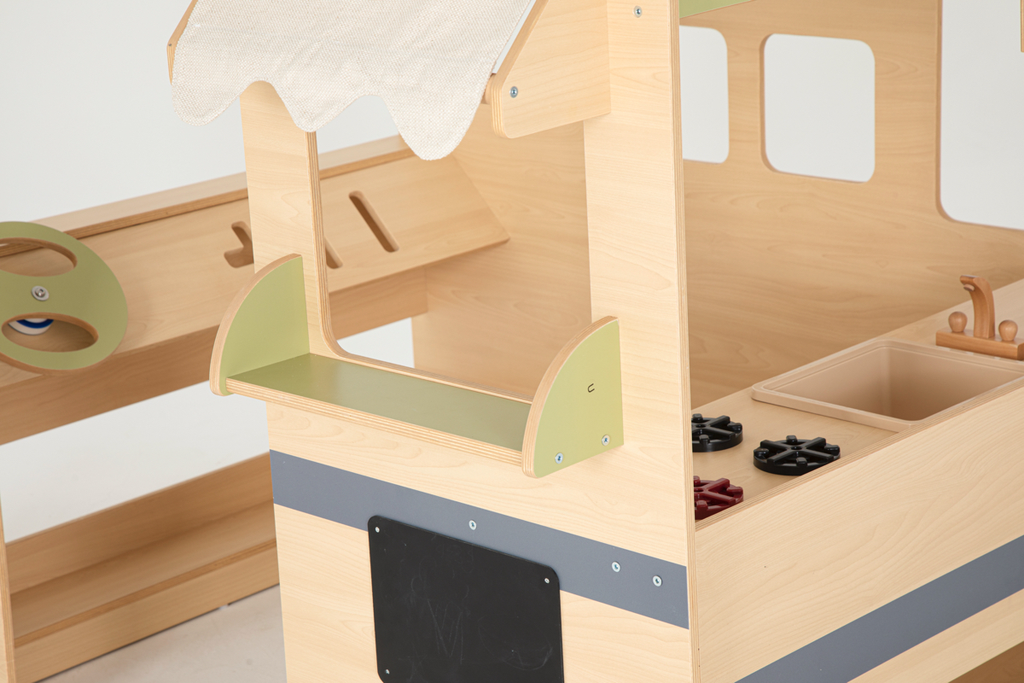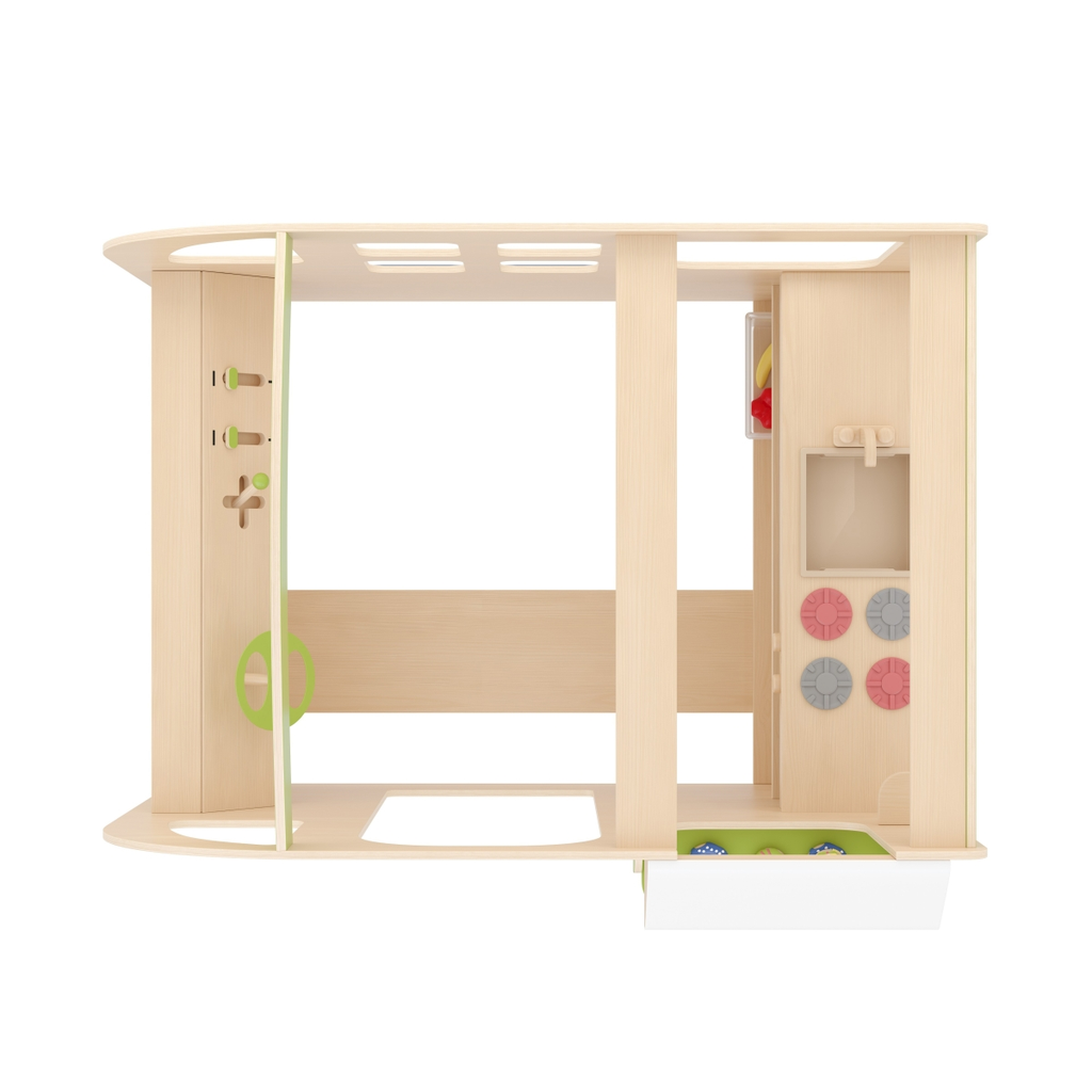 De Food Truck verandert elke ruimte in een kleine belevingswereld. Kinderen kunnen hier koken, verkopen of inkopen doen en spelenderwijs in verschillende rollen kruipen. Uitgerust met een kookplaat, toonbank en krijtbord biedt hij talloze mogelijkheden voor creatieve spelideeën. Het stevige populierenmultiplex met melaminecoating maakt hem bijzonder duurzaam en onderhoudsvriendelijk – ideaal voor dagelijks gebruik in kinderopvang en onderwijsinstellingen.
