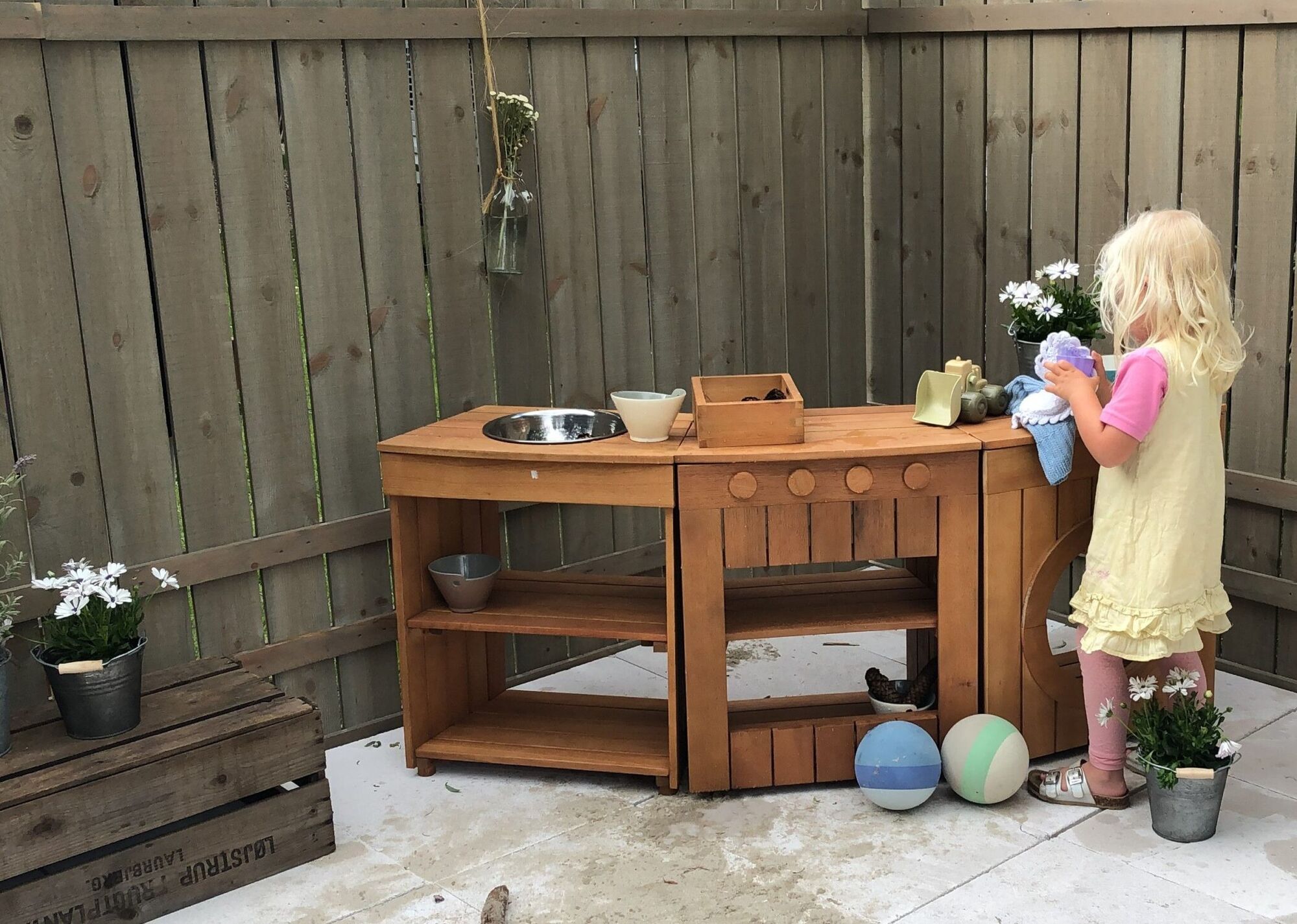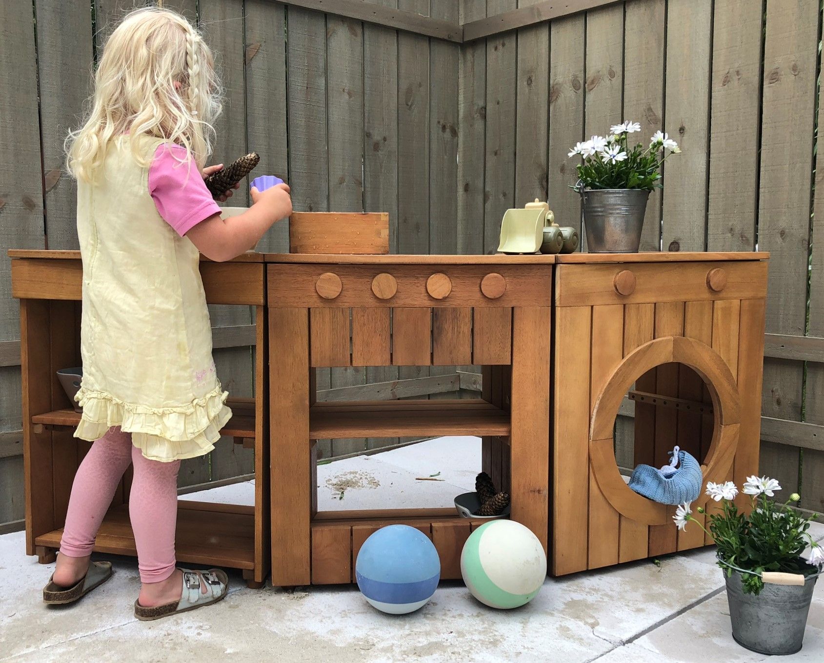 Deze Gebogen Keukenset is een complete keukenopstelling voor buitengebruik, bestaande uit een fornuis, gootsteen en wasmachine. Het stevige houten ontwerp is perfect voor creatief rollenspel in de speeltuin, tuin of binnenruimte. Stimuleer imaginatie, samenwerking en sociale vaardigheden terwijl kinderen zich vermaken met koken, wassen en schoonmaken.