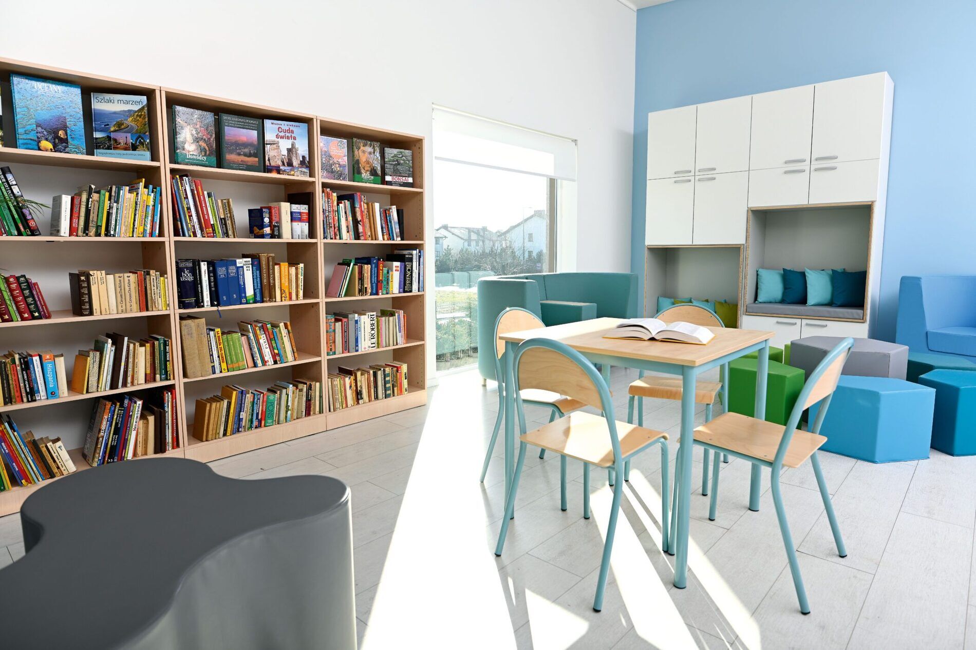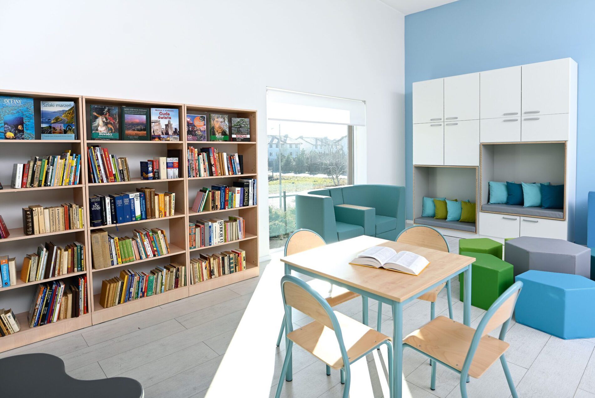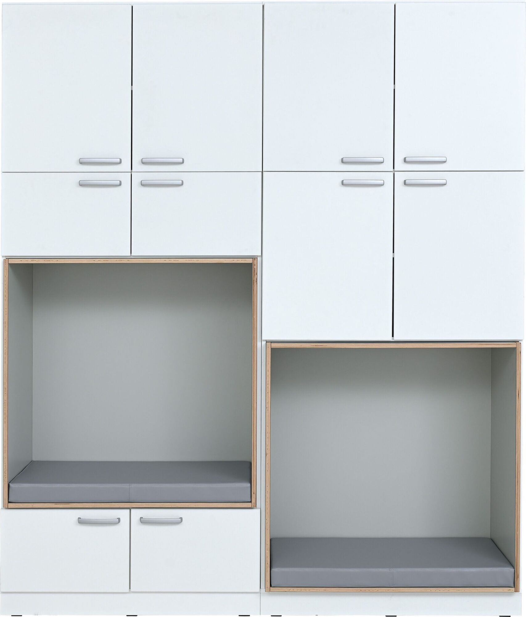 Een ruime opbergkast, geschikt voor gebruik in de kinderopvang, basisscholen of bijvoorbeeld zorginstellingen. De zitting in de kast is bekleed met grijs HPL gelamineerd multiplex en binnenin ligt een matras met een onderhoudsvriendelijke hoes. Achter elke middelgrote deur zit 1 verstelbare plank. Wandmontage vereist.