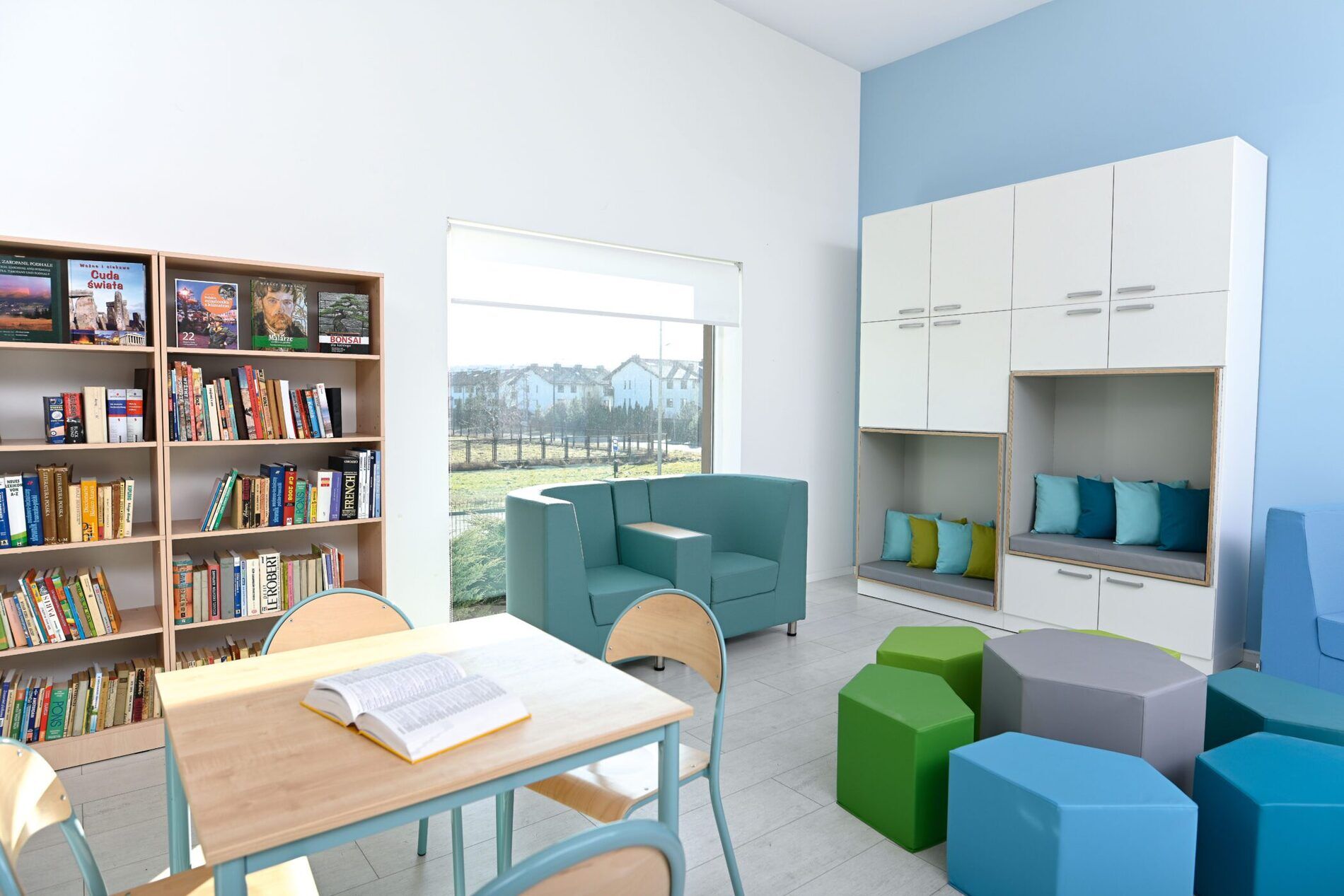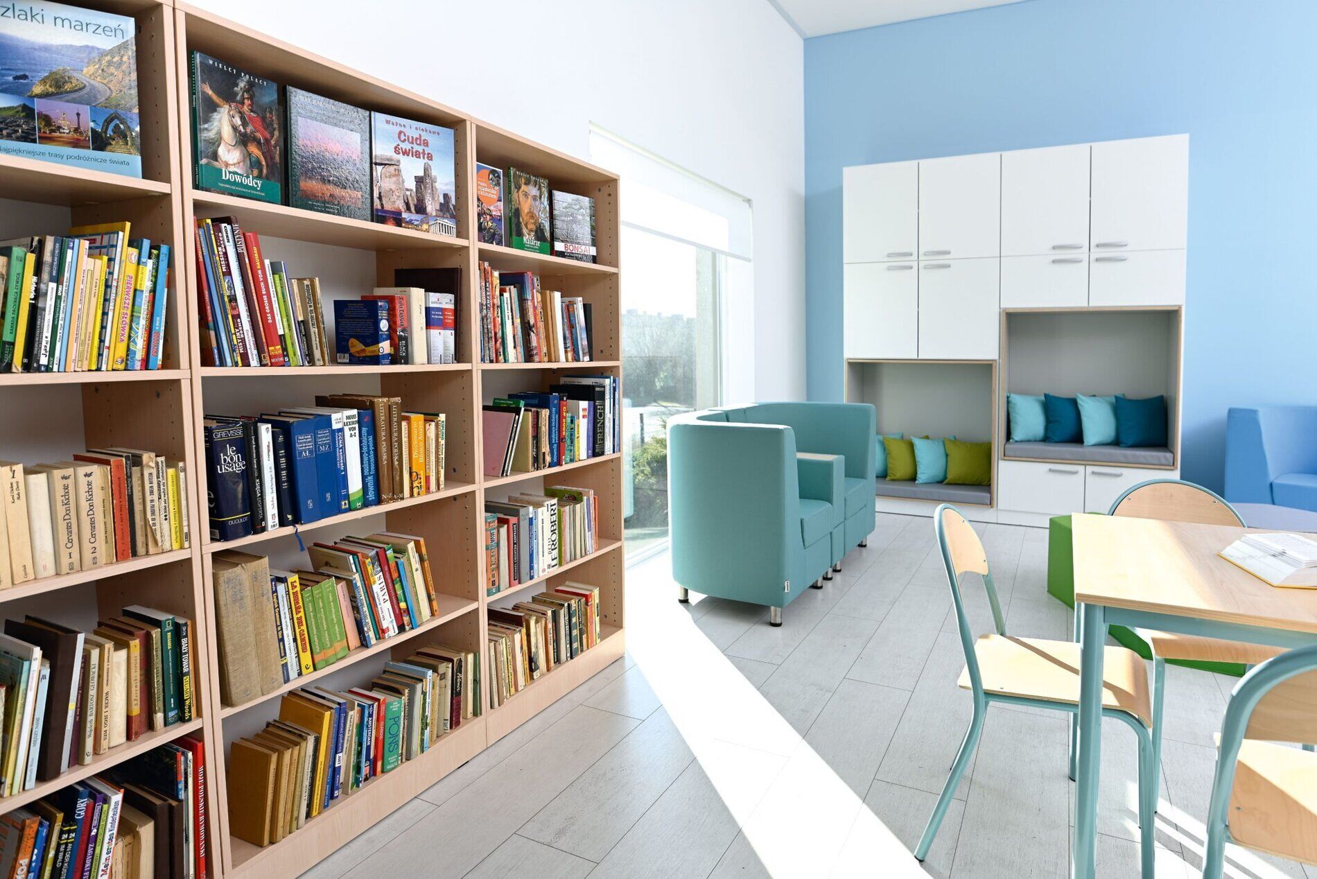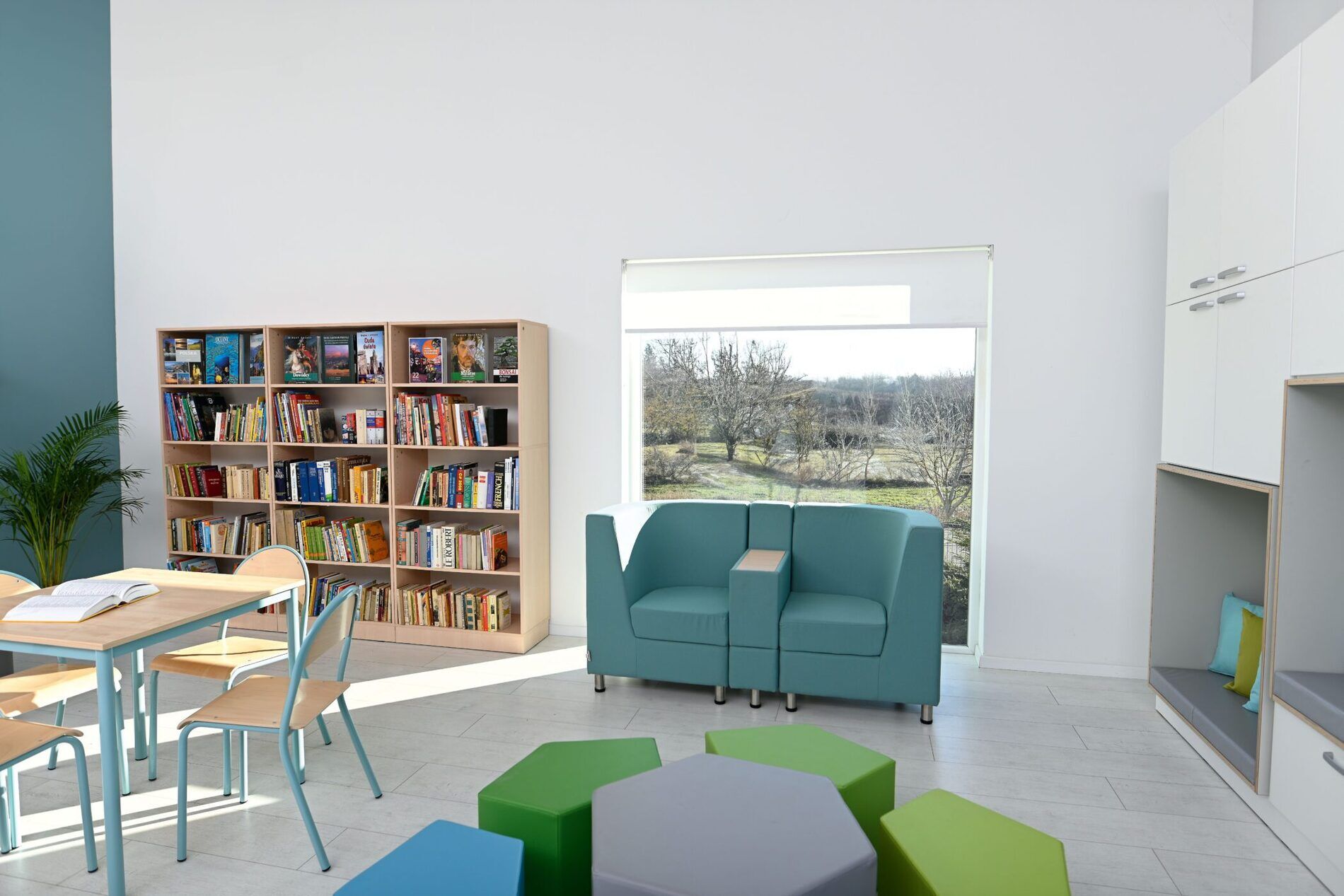 Een ruime opbergkast, geschikt voor gebruik in de kinderopvang, basisscholen of bijvoorbeeld zorginstellingen. De zitting in de kast is bekleed met grijs HPL gelamineerd multiplex en binnenin ligt een matras met een onderhoudsvriendelijke hoes. Achter elke middelgrote deur zit 1 verstelbare plank. Wandmontage vereist.