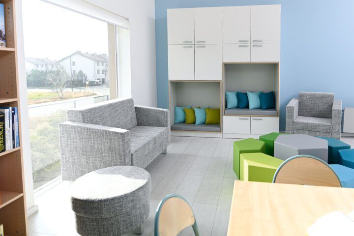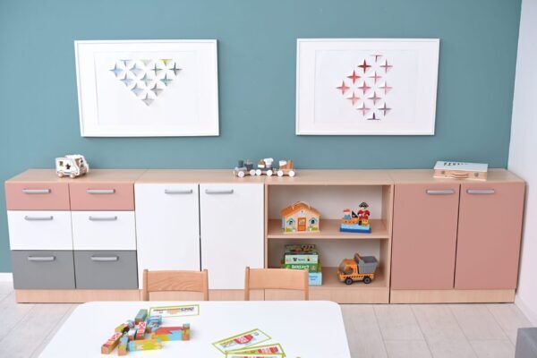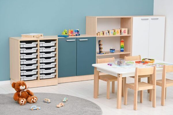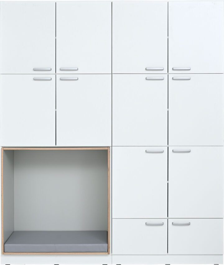 Een ruime opbergkast, geschikt voor gebruik in de kinderopvang, basisscholen of bijvoorbeeld zorginstellingen. De zitting in de kast is bekleed met grijs HPL gelamineerd multiplex en binnenin ligt een matras met een onderhoudsvriendelijke hoes. Achter elke middelgrote deur zit 1 verstelbare plank. Wandmontage vereist.