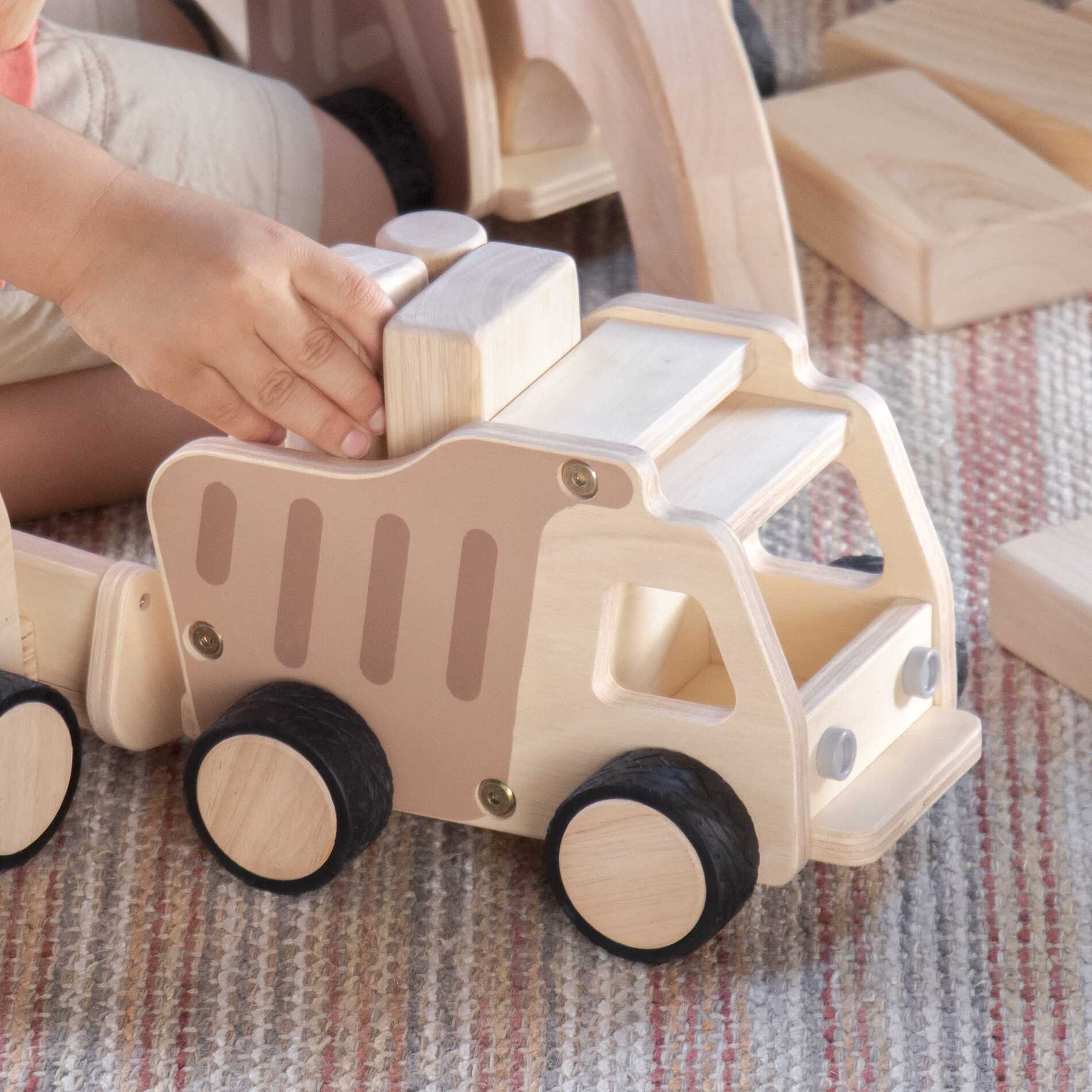 - Duurzame houten voertuigen voegen verbeterde dramatische spelelementen toe aan het traditionele blokkenspel