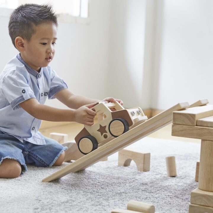 - Duurzame houten voertuigen voegen verbeterde dramatische spelelementen toe aan het traditionele blokkenspel