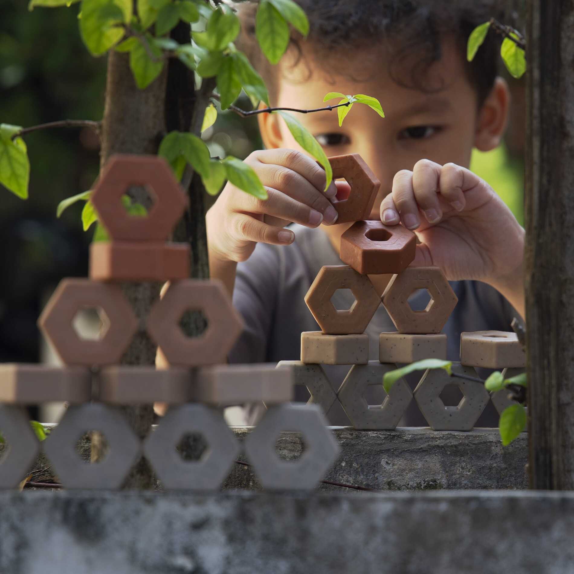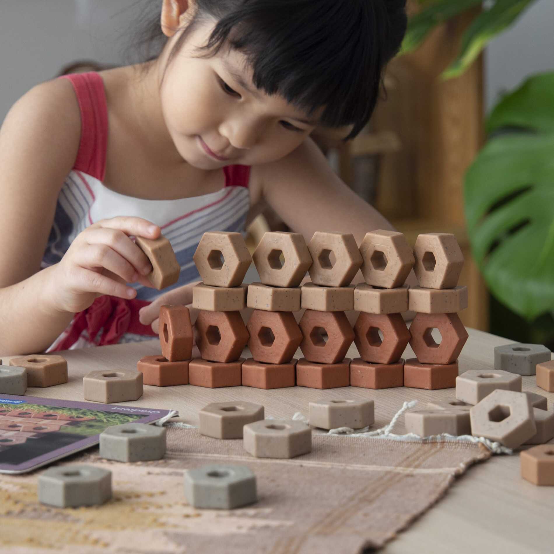 Verhoog de authenticiteit van de open bouwervaring van uw kind met deze verzwaarde bouwstenen- set van 60 stuks. Kinderen vanaf 2 jaar zullen deze zeshoekige miniatuurstenen verwerken in unieke bouwwerken terwijl ze stapelen, patronen maken en natuurlijke, losse onderdelen gebruiken. De matte textuur van het oppervlak ondersteunt het spel binnen en buiten en is bestand tegen water, vuil, zand en modder. De set bevat 10 dubbelzijdige conceptkaarten die dienen als creatieve inspiratie voor de praktische bouwervaring.