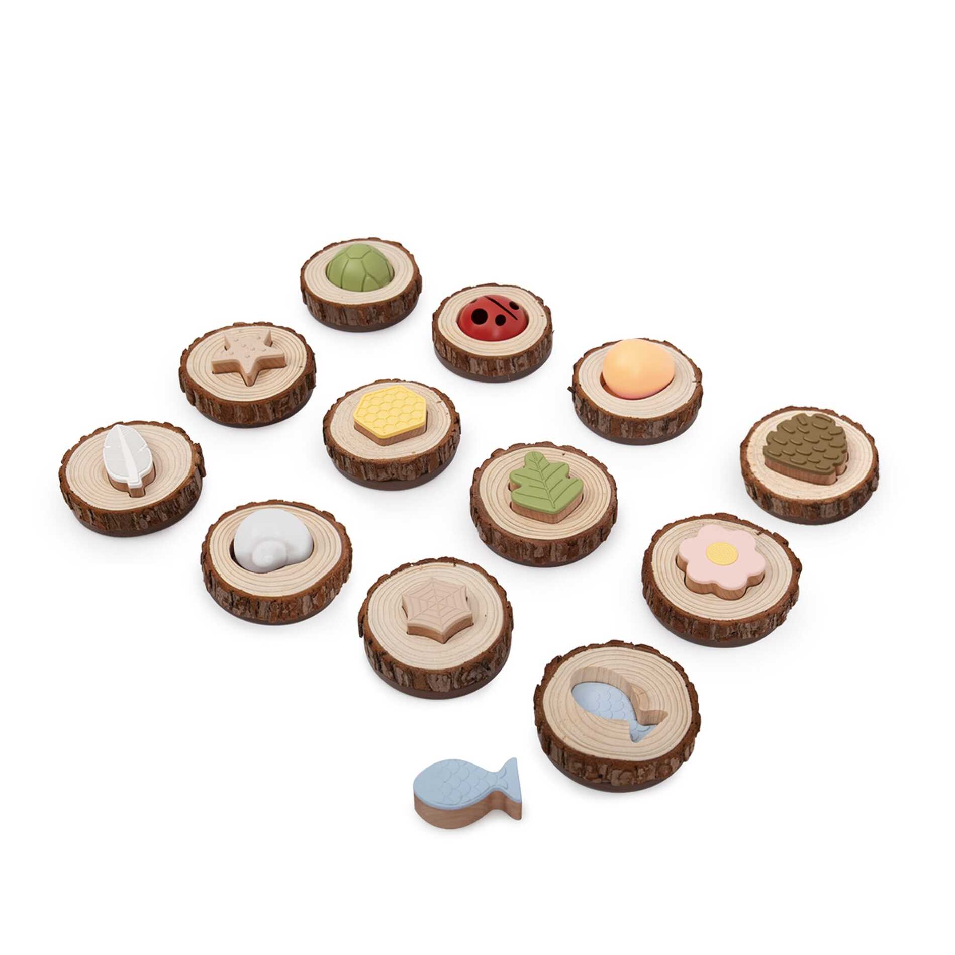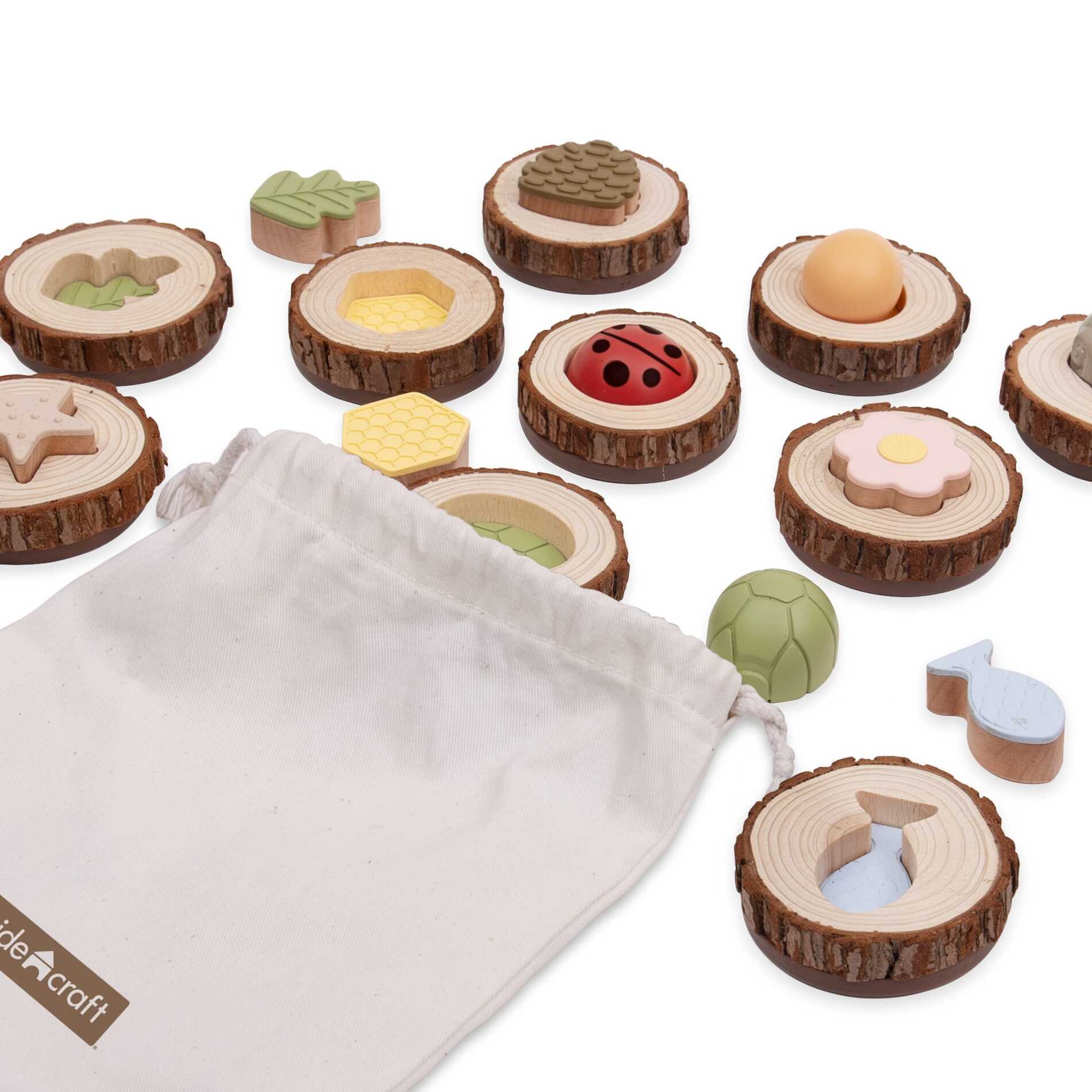Kinderen vanaf 3 jaar zullen hun zintuigen aanspreken en hun geheugen versterken tijdens het spelen van deze verhoogde, op de natuur geïnspireerde versie van een klassiek matchingspel. Stukjes die bloemen, spinnenwebben, lieveheersbeestjes, schildpadschilden, eieren, dennenappels en andere natuurlijke materialen voorstellen die kinderen al in verband brengen met de natuur, zorgen voor gemakkelijke herkenning en herinnering tijdens het spelen. De grote, houten koekjesbodems zullen na verloop van tijd op natuurlijke wijze slijten, waardoor kinderen oorzaak en gevolg gedrag en natuurlijke evolutie te zien krijgen.
