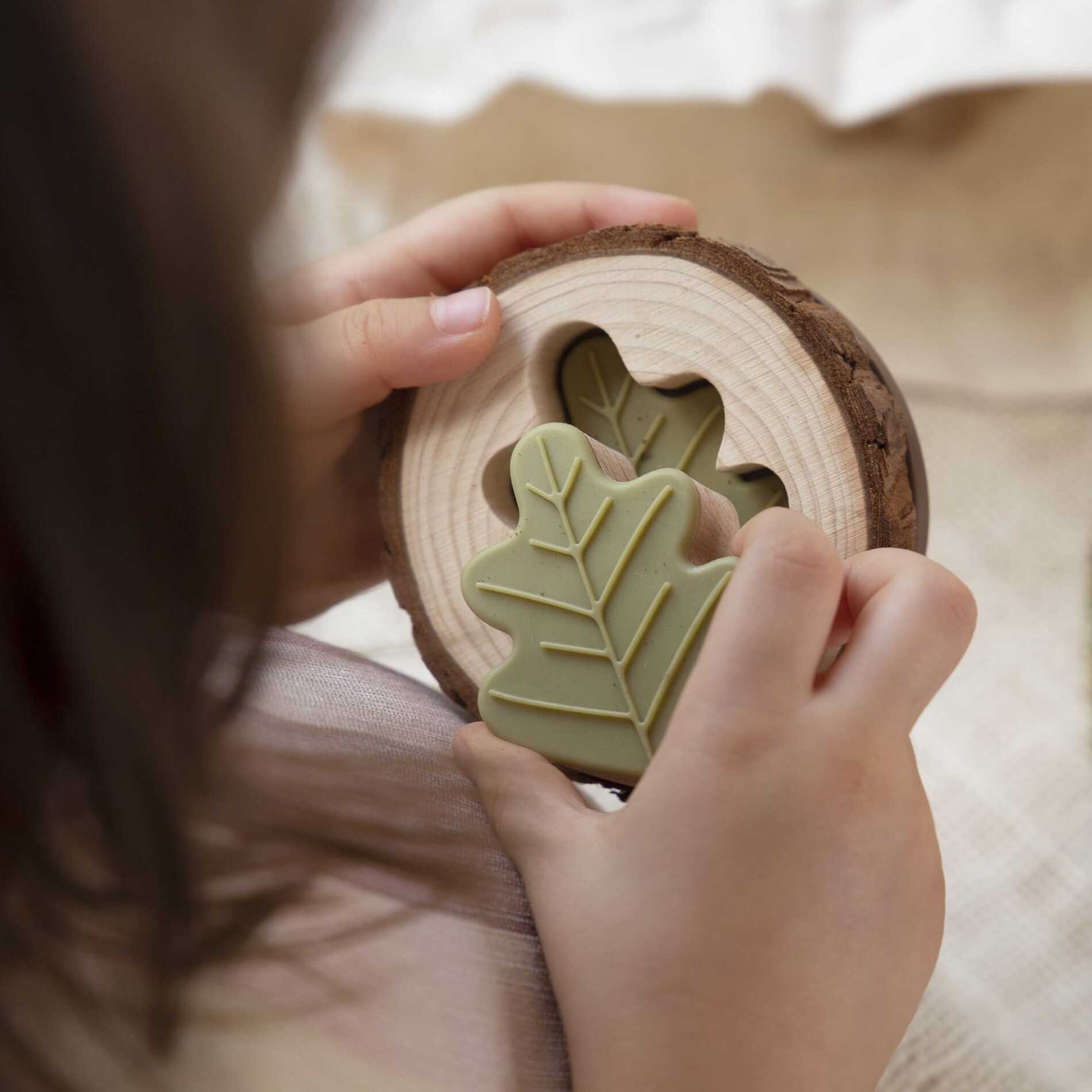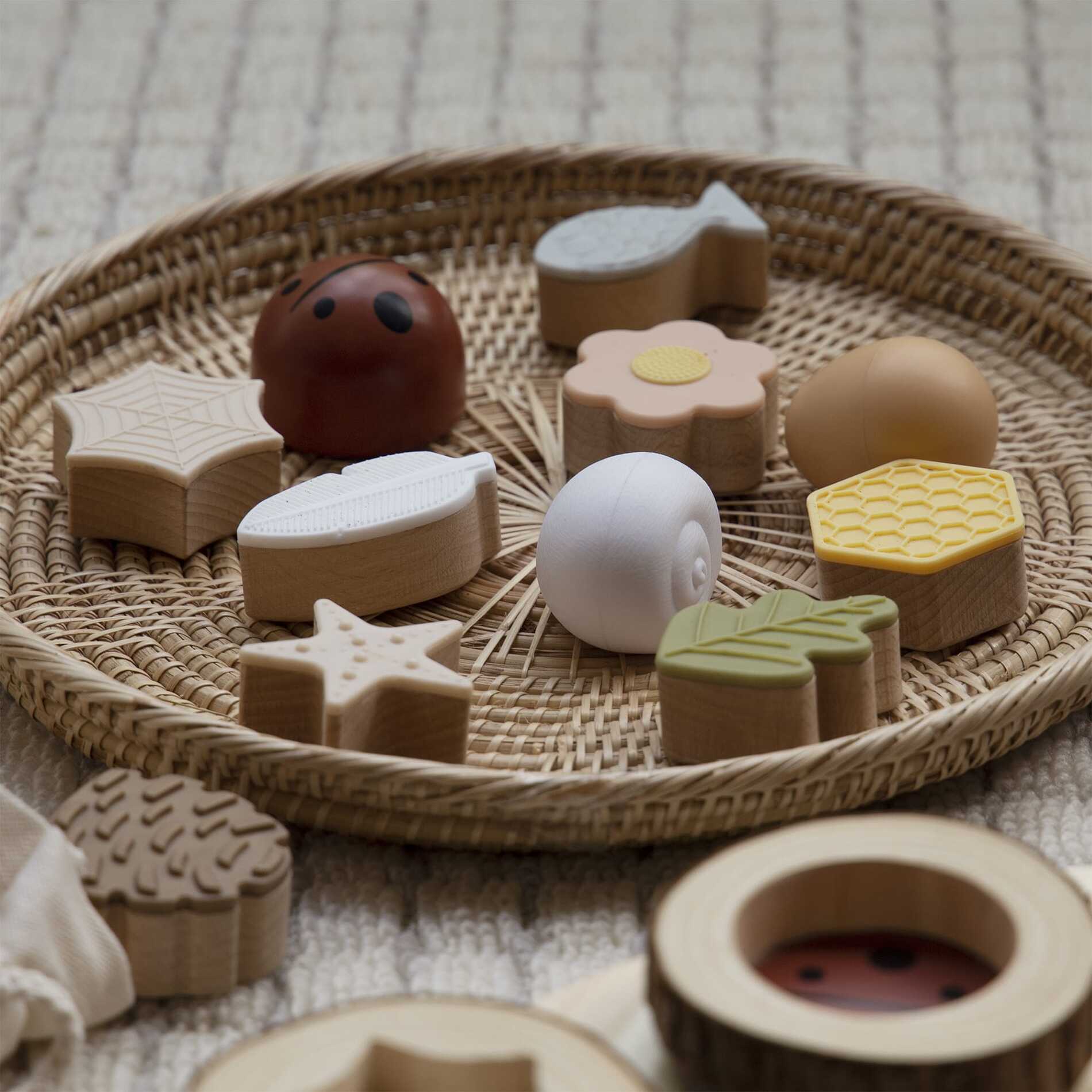 Kinderen vanaf 3 jaar zullen hun zintuigen aanspreken en hun geheugen versterken tijdens het spelen van deze verhoogde, op de natuur geïnspireerde versie van een klassiek matchingspel. Stukjes die bloemen, spinnenwebben, lieveheersbeestjes, schildpadschilden, eieren, dennenappels en andere natuurlijke materialen voorstellen die kinderen al in verband brengen met de natuur, zorgen voor gemakkelijke herkenning en herinnering tijdens het spelen. De grote, houten koekjesbodems zullen na verloop van tijd op natuurlijke wijze slijten, waardoor kinderen oorzaak en gevolg gedrag en natuurlijke evolutie te zien krijgen.