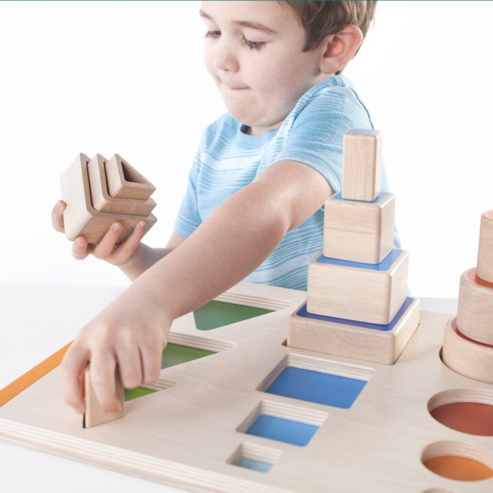 Bouw, match en vergelijk deze mooie, kleurrijke, stapelbare blokken. Het duurzame activiteitenbord is glad geschuurd en is versterkt met zachte kunststof handgrepen. Stimuleer kleur en grootte ontdekking, ruimtelijk denken en fijn motorische vaardigheden met behulp van de kleurrijke en herkenbare vormen.