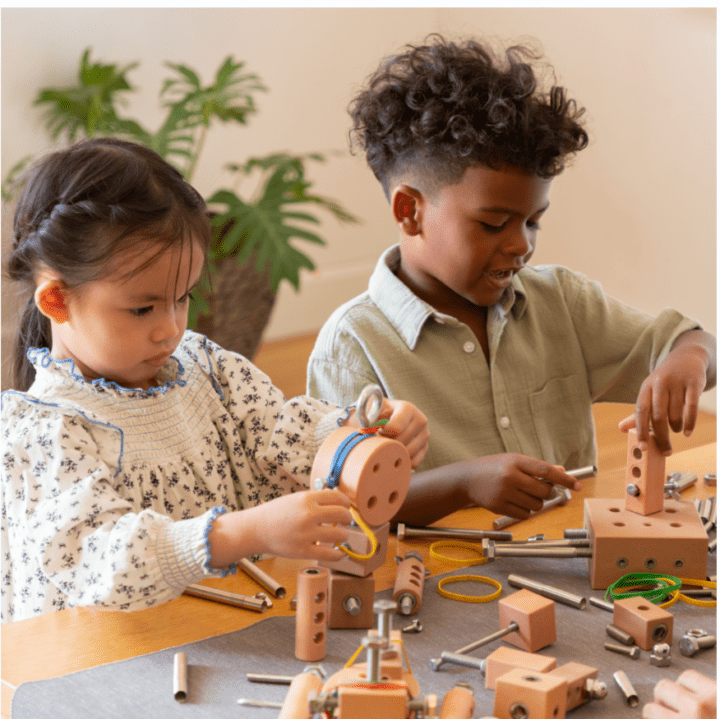 - Compleet bouwpakket met verschillende bouten en moeren, elastiekjes en blokken gemaakt van duurzaam Poly+