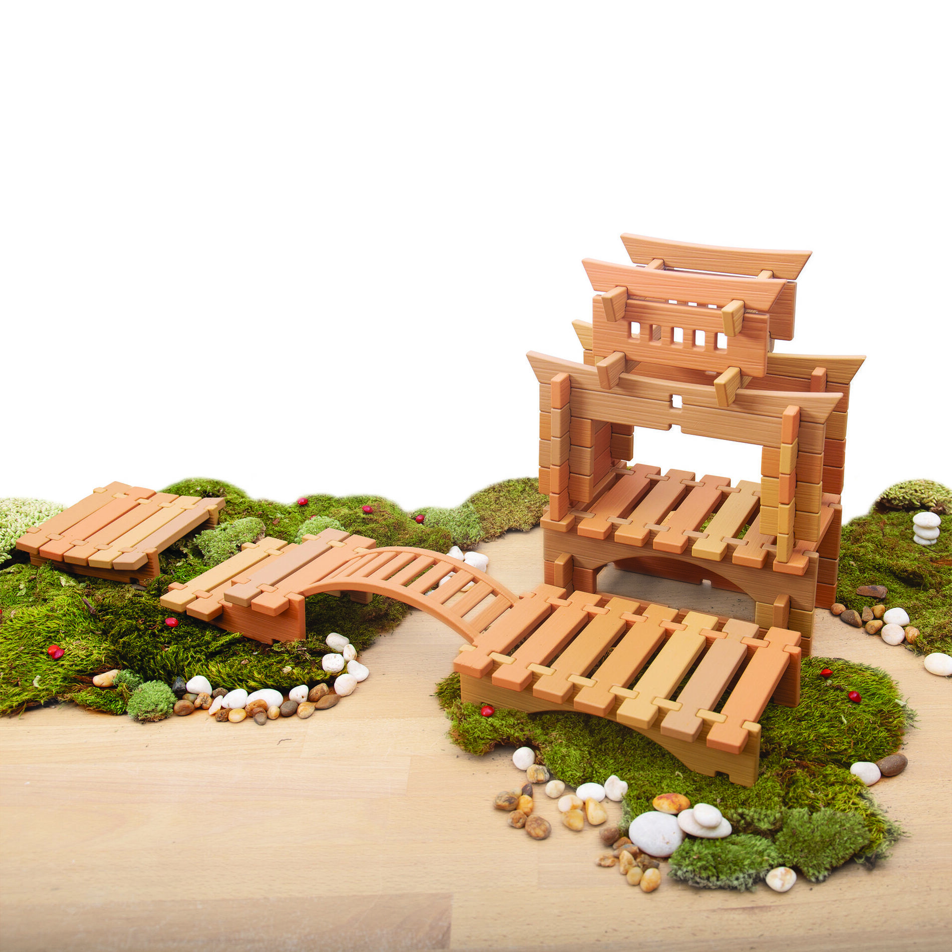 Kinderen vanaf 3 jaar kunnen binnen en buiten bouwen met de Tabletop Notch Blocks – Estern 87-delige set. Een prachtige set voor creatieve en bouwkundige kinderen. 10 dubbelzijdige inspiratiekaarten geven afbeeldingen van relevante oosterse architectonische ontwerpen.