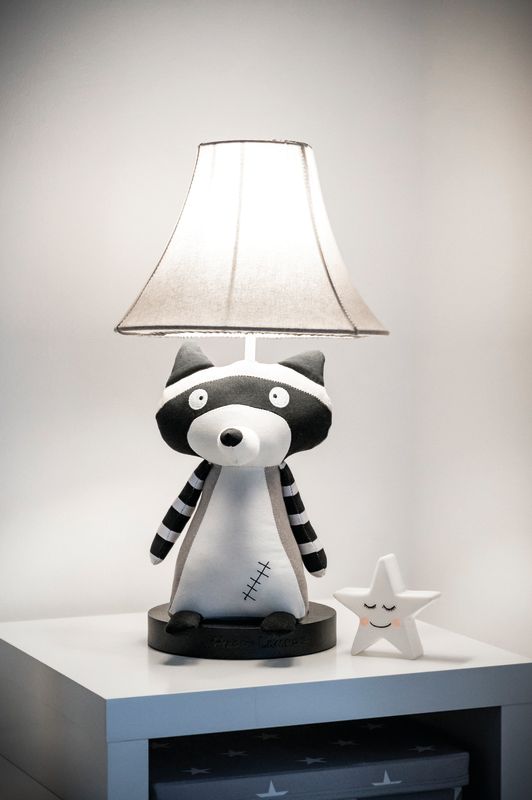 Ben heeft een klein litteken op zijn buik die hij heeft opgelopen bij zijn laatste avontuur. Hij zit stevig op zijn zwarte grondplaat met het subtiele "Happy Lamps" reliëf, wachtend op zijn volgende gebruik in de avond. Zijn lampenkap zorgt voor een aangenaam licht. De gestreepte armen en staart maken zijn coole look af.