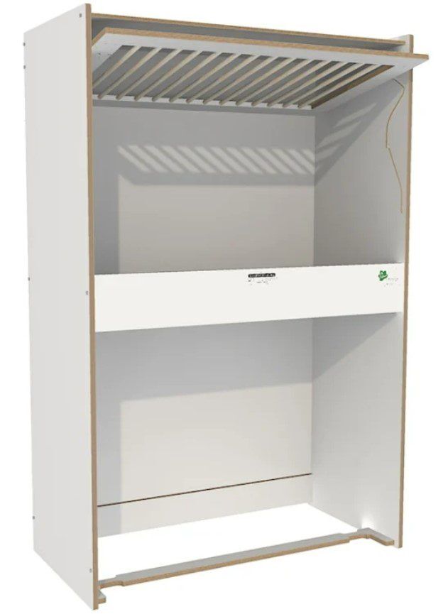 Witte hoogslaper voorzien van kantelhekken met spijlen en een drukknopslot met slotbeveiliging. Onder de hoogslaper kan je een evacuatiebedje (A900366) plaatsen.