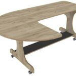 Multifunctionele hoogzittafel in J-vorm. Door de ronding in de tafel kunnen er kinderstoelen aan de kopse kant gezet worden zonder dat deze ruimte van een bank innemen. Wanneer 2 J-tafels gecombineerd worden ontstaat er een ovalen vorm, of schuif de tafels iets uit elkaar zodat een leidster in het midden kan zitten.